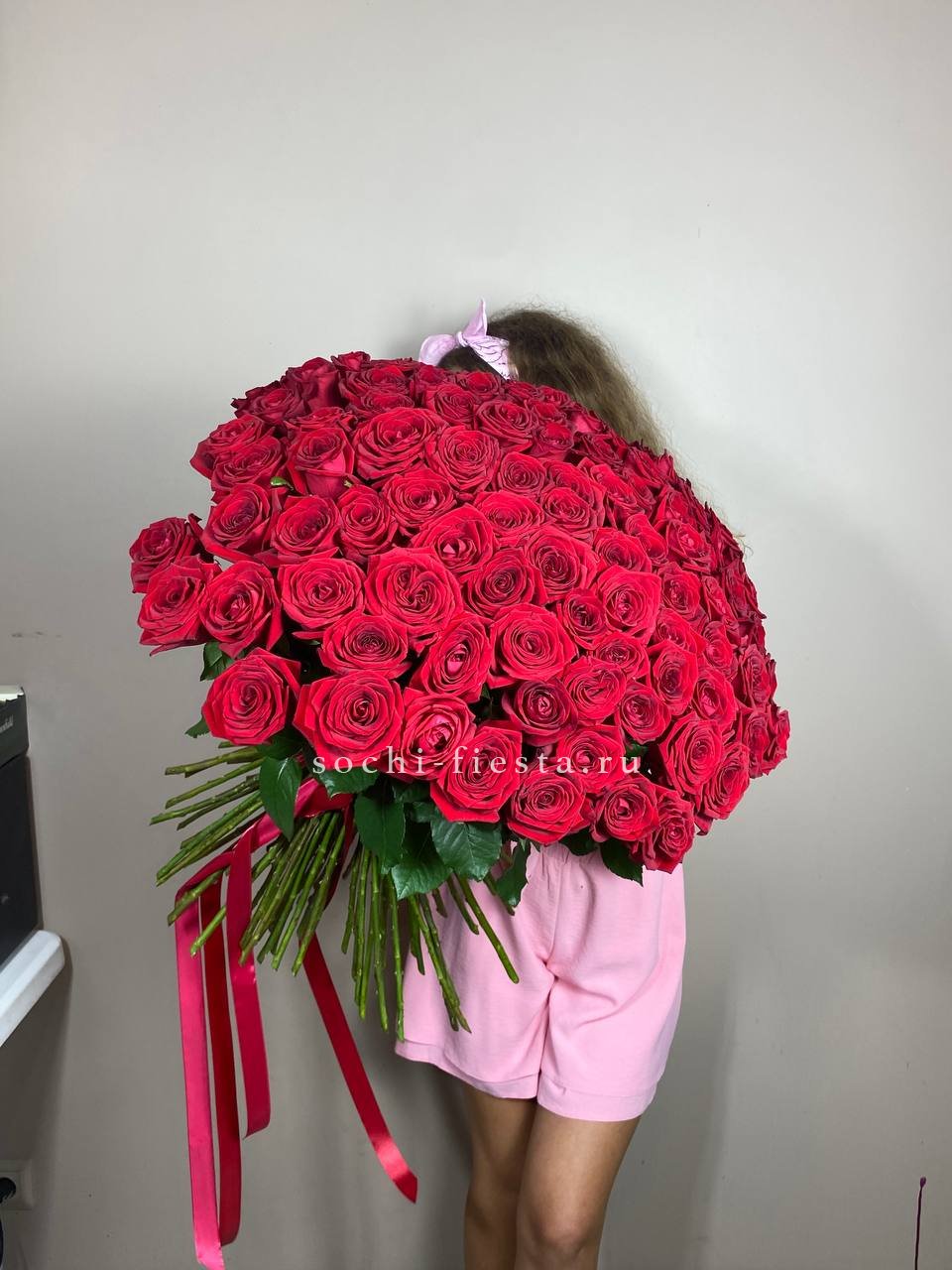 Сто одна голландская роза в букете — это история о масштабе и впечатлении. Объем композиции наполняет комнату и мгновенно притягивает внимание своим присутствием.