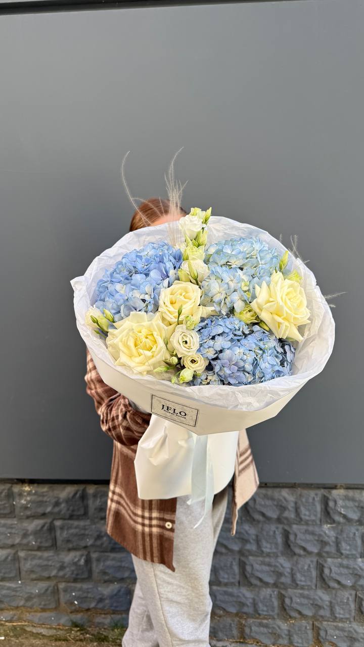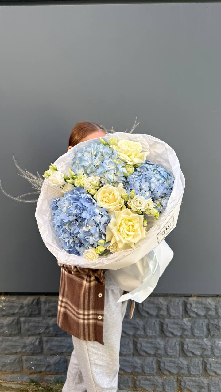 Воздушная палитра белого с голубыми переливами дарит ощущение прохлады и свежести. Пять соцветий гортензии образуют мягкую композицию, где каждый оттенок перетекает в другой, создавая глубину.