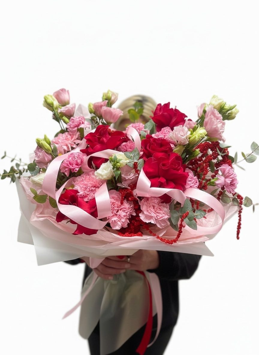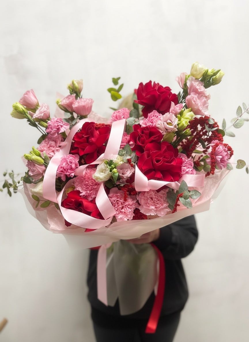 Пятьдесят пять бутонов собраны в плотную округлую форму, где каждый цветок читается отдельно. Красный здесь звучит насыщенно и глубоко, создавая мощное визуальное присутствие. Букет держит форму и занимает пространство уверенно.