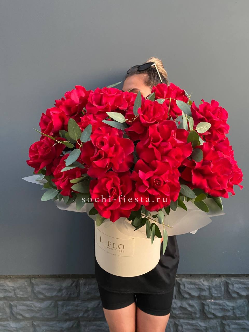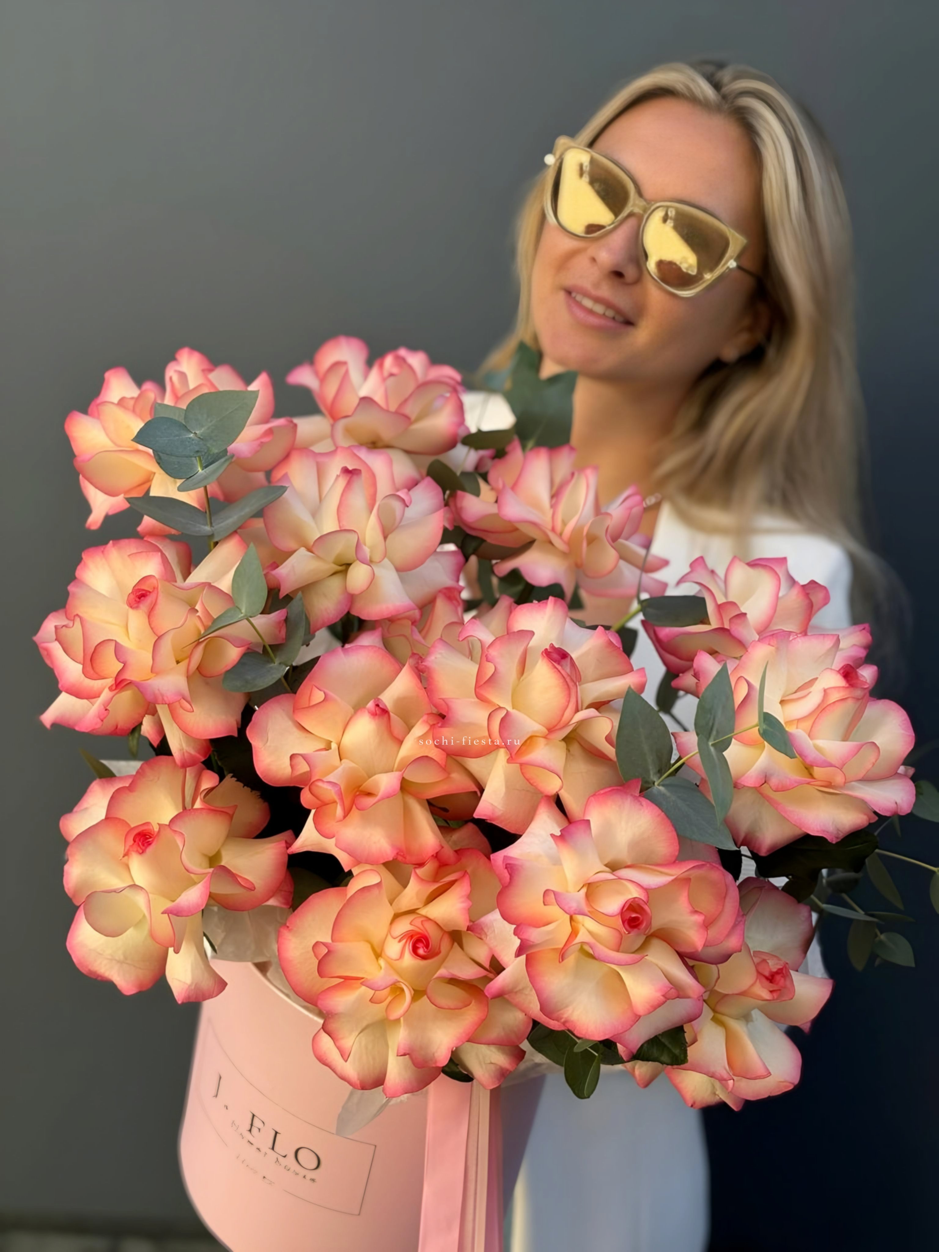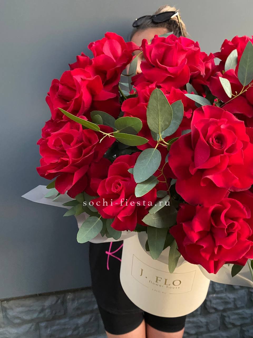 Пышная композиция из одноголовых и кустовых роз в дизайнерской пленке. Эвкалипт добавляет графичности, а лента завершает образ.