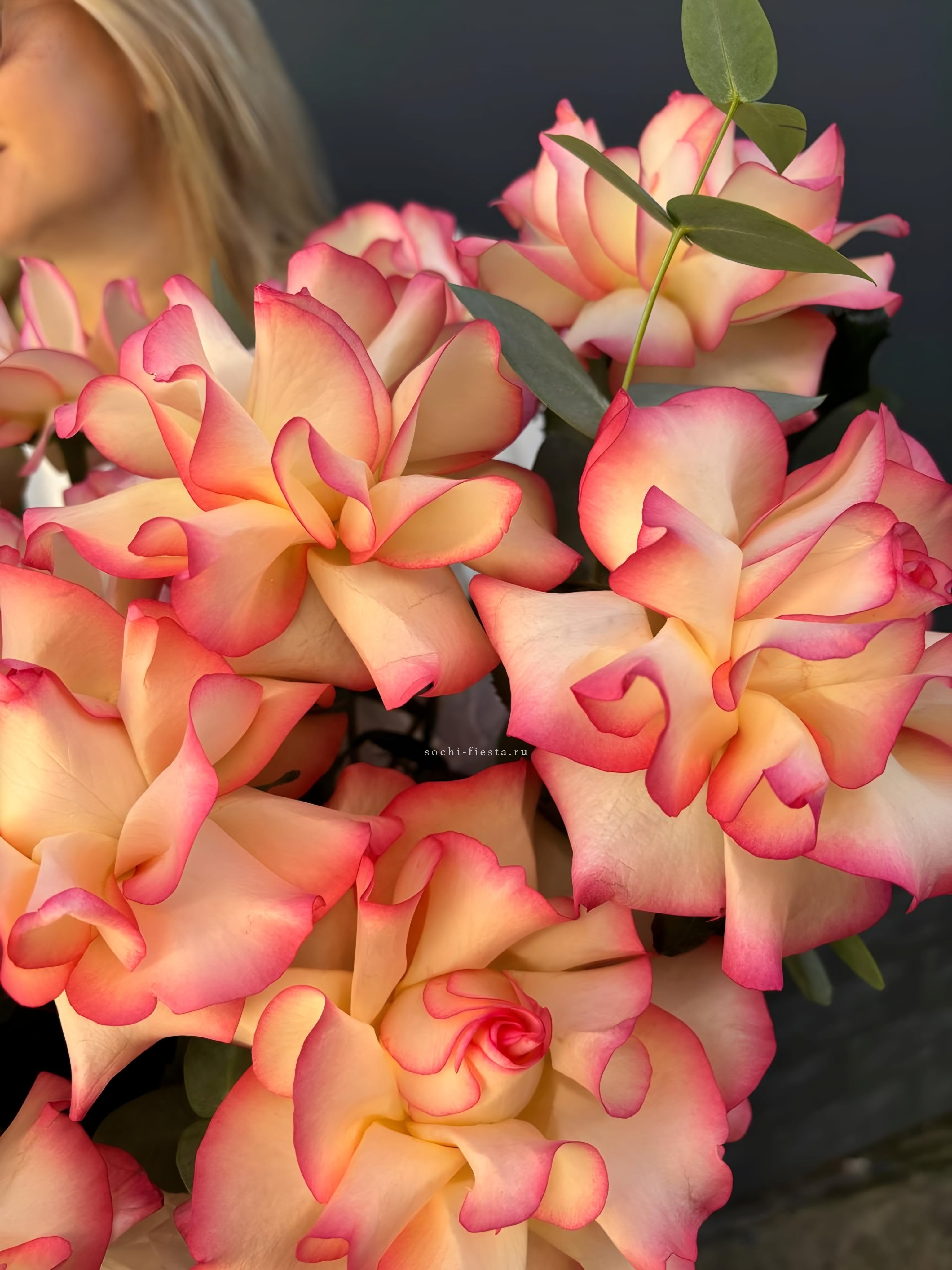 одноголовые розы, розы кустовые, эвкалипт, лента, дизайнерская пленка.
