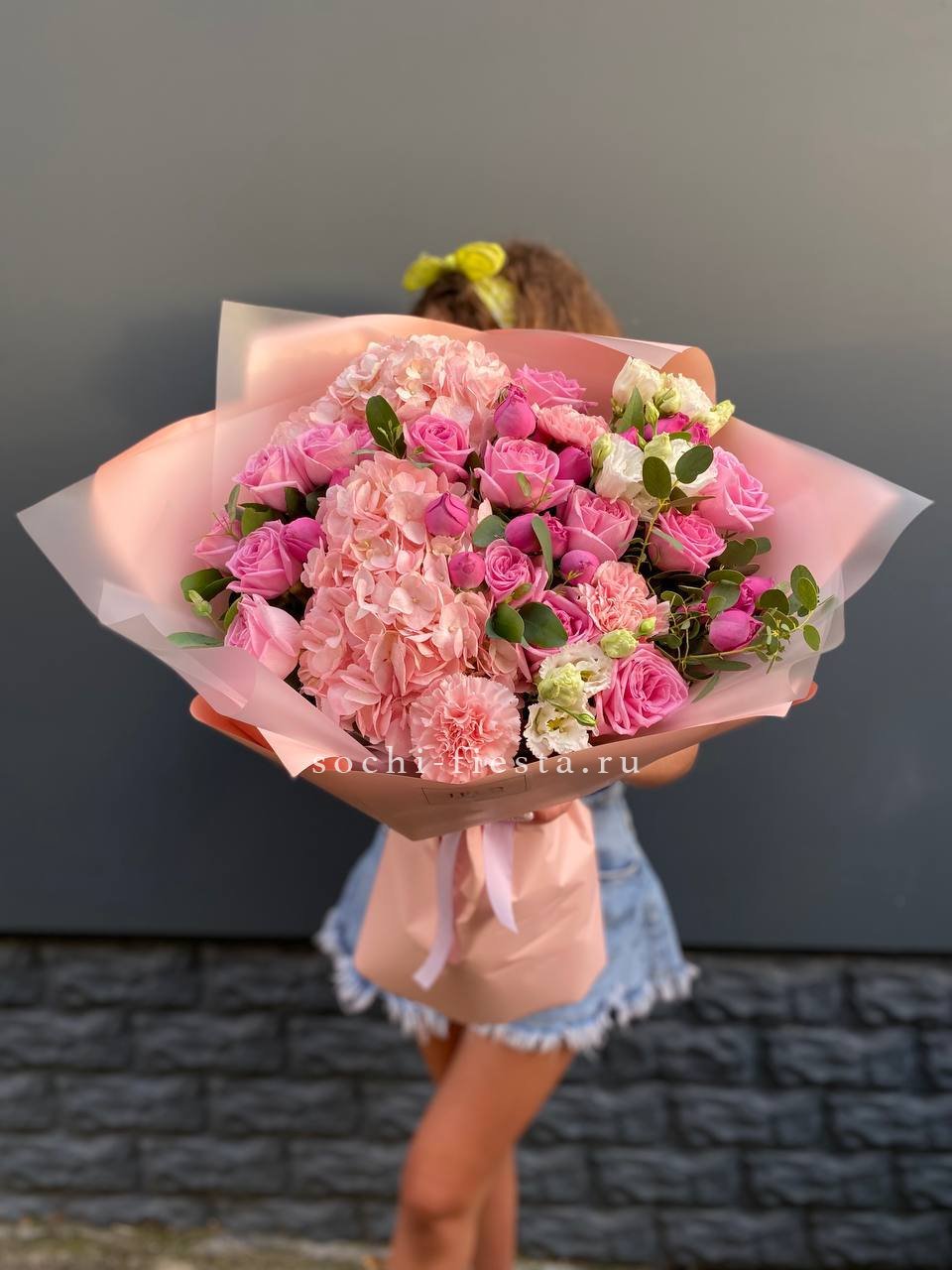 Пышная композиция объединяет крупные соцветия гортензии с бархатными розами и воздушной эустомой. Мисти бабблс и диантус создают мягкую дымку вокруг центральных бутонов. Веточки эвкалипта добавляют свежести и завершают образ.