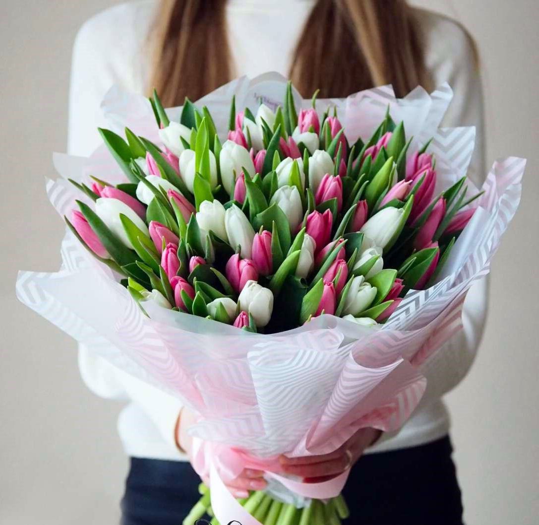 55 тюльпанов, лента, дизайнерская пленка.
