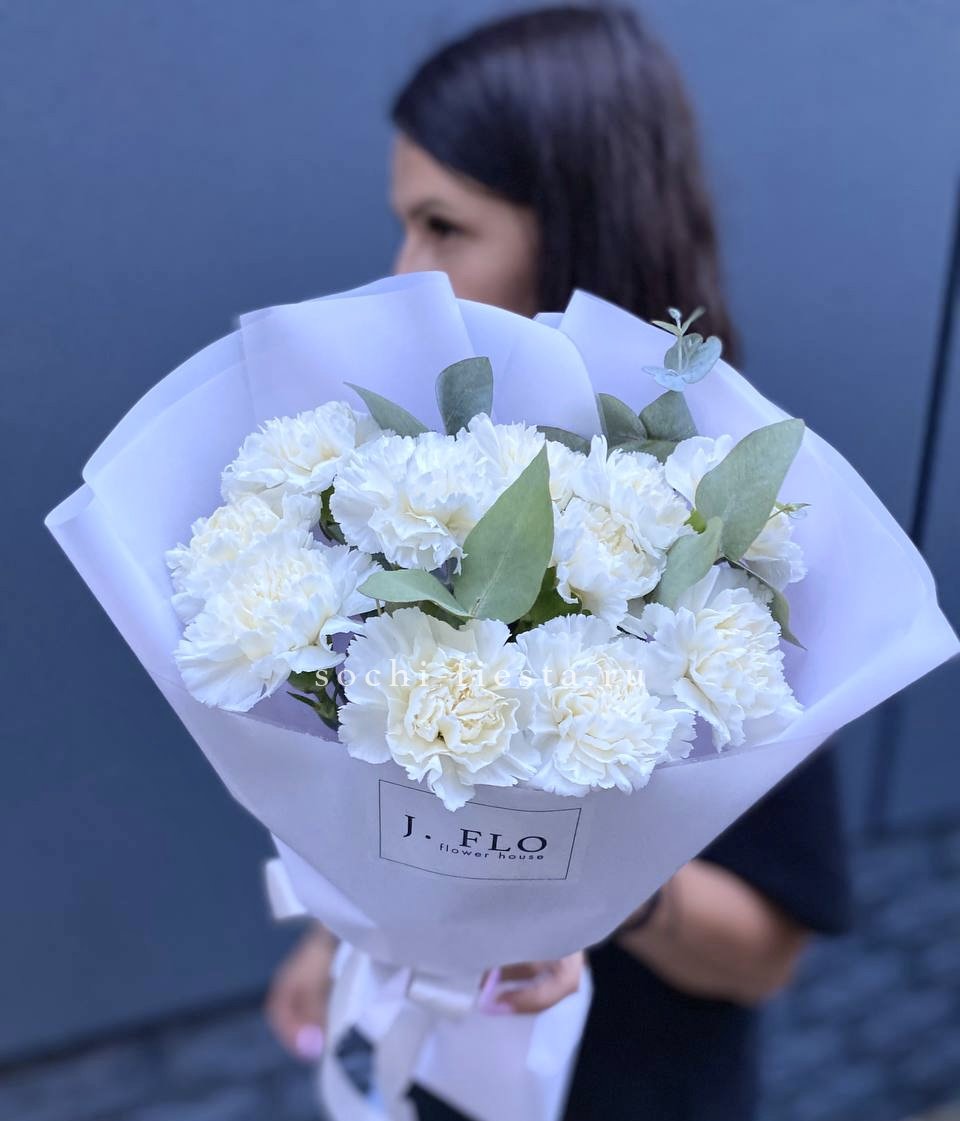 Семь кремовых диантусов раскрываются мягкими многослойными головками. Эвкалипт добавляет воздуха между бутонами и создает легкую асимметрию в общей форме.