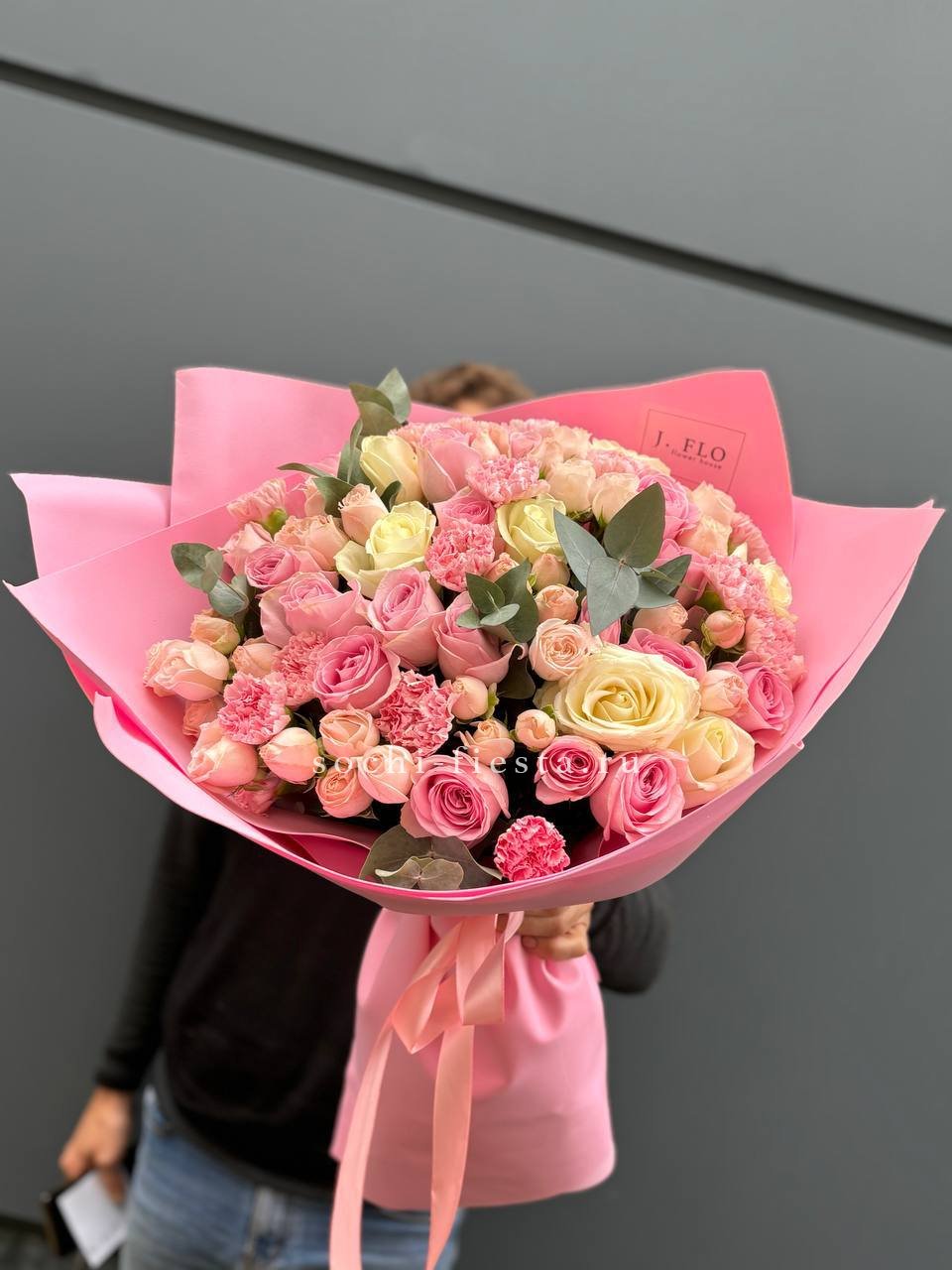 Пышная гортензия задает объем, а французские розы и эустома создают многослойную глубину. Диантусы добавляют графичные точки, эвкалипт обрамляет композицию мягкими линиями.