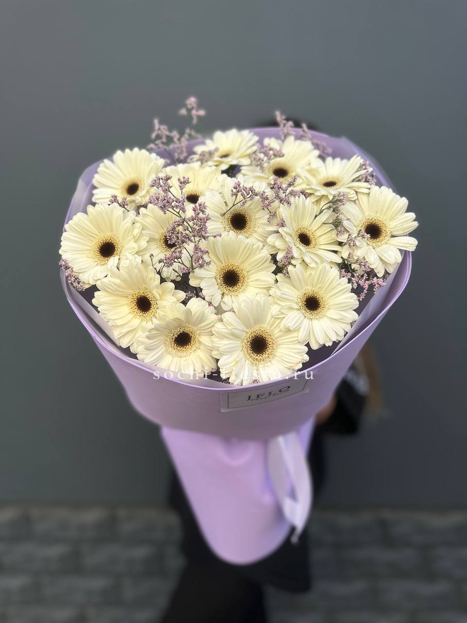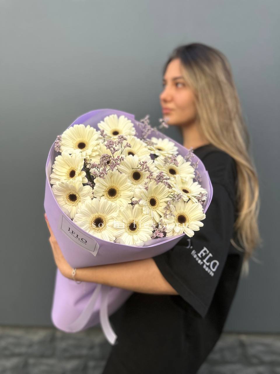 Букет заполняет пространство благодаря двадцати одной гербере с широкими головками. Плотная сборка и дизайнерская упаковка создают завершённый образ. Оттенок выбирается по желанию.