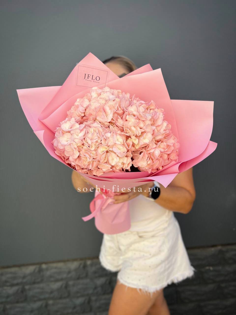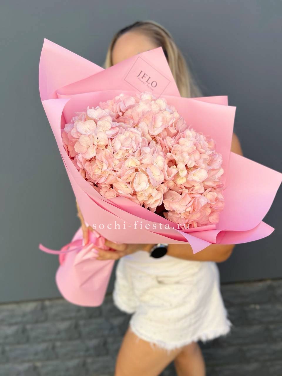Двадцать пять соцветий гортензий разных оттенков формируют пышное облако с естественной игрой цвета. Каждая головка раскрывается по-своему, создавая живую фактуру без четких границ между тонами.