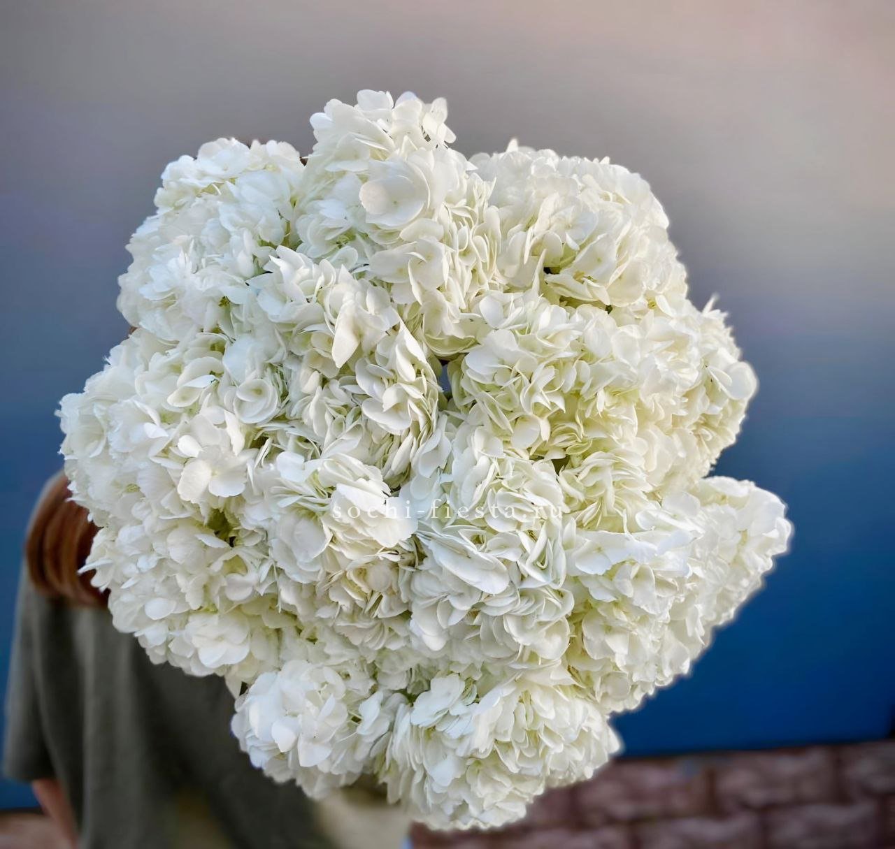 Пышная шапка гортензии в мягкой тонированной упаковке напоминает облако в обрамлении ткани. Соцветие раскрывается множеством мелких лепестков, создавая объёмную текстуру и живую игру оттенков.