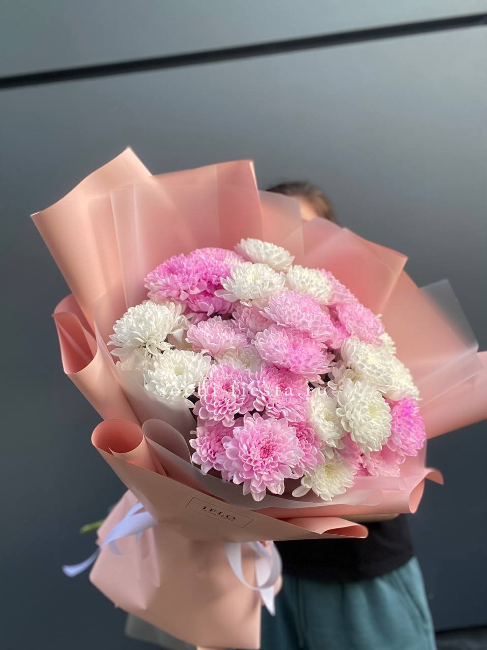 Бело-розовые кустовые хризантемы создают мягкий переход оттенков. Лепестки формируют воздушную структуру, где светлые тона перетекают в насыщенные. Композиция дышит и притягивает взгляд своей лёгкостью.