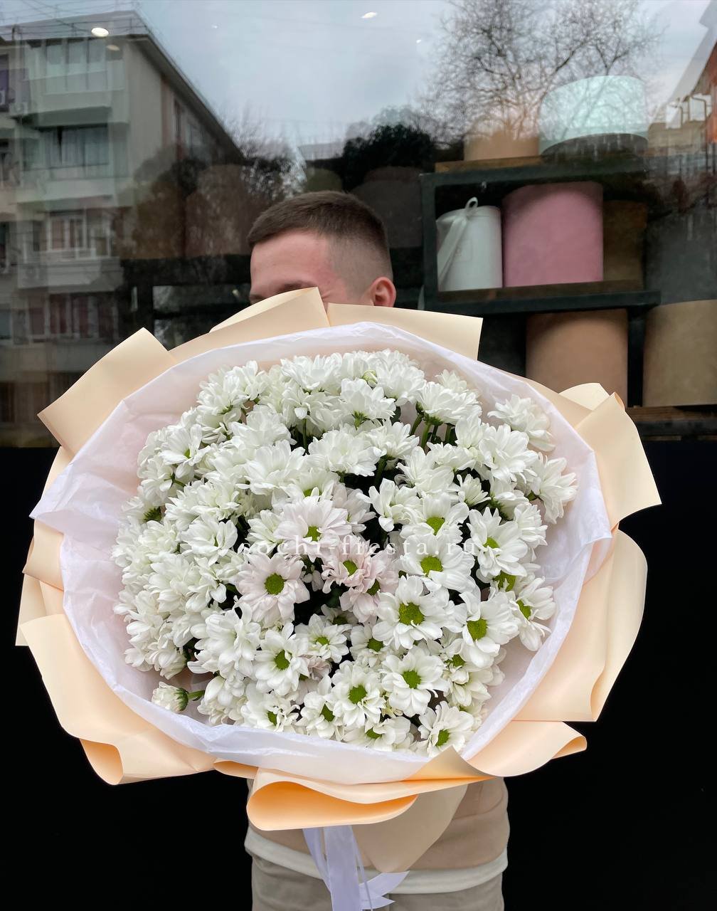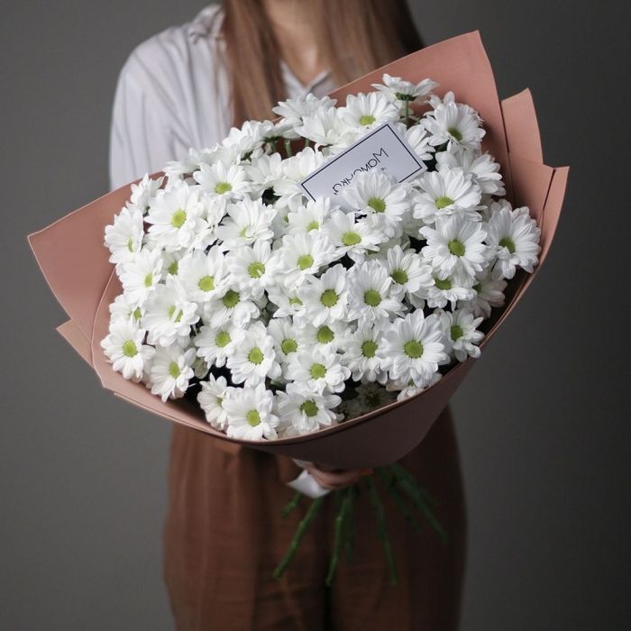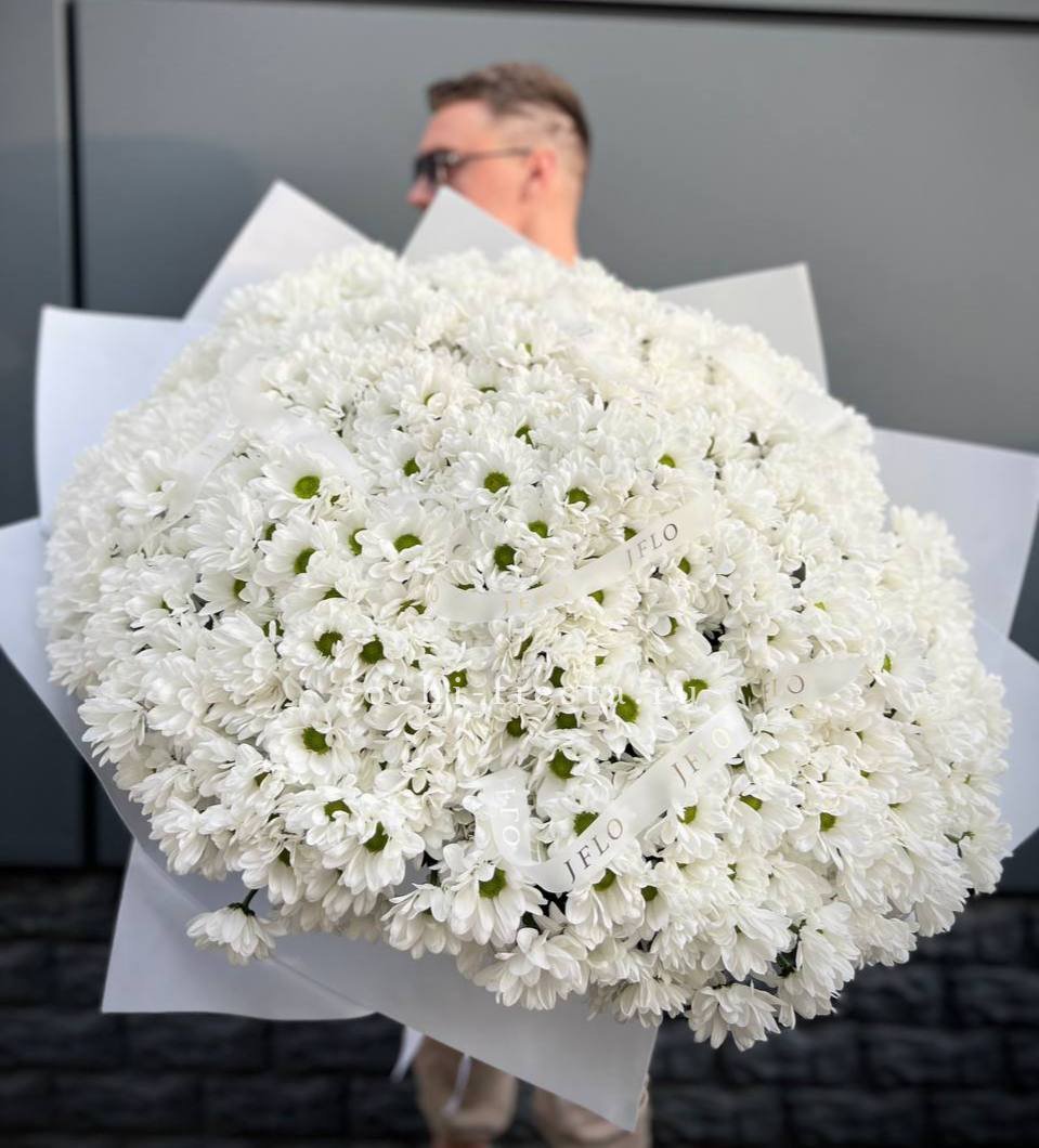 Девять кустовых хризантем собраны в плотный круглый силуэт. Каждая ветка раскрывается веером мелких соцветий, создавая объёмную текстуру. Букет держит форму и выглядит графично.