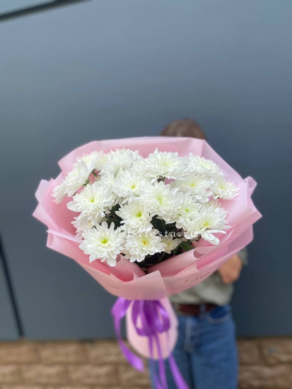 Пятнадцать веток кустовой хризантемы образуют пышное облако из множества соцветий. Каждая ветка раскрывается по-своему, создавая живую текстуру и объёмный силуэт букета.
