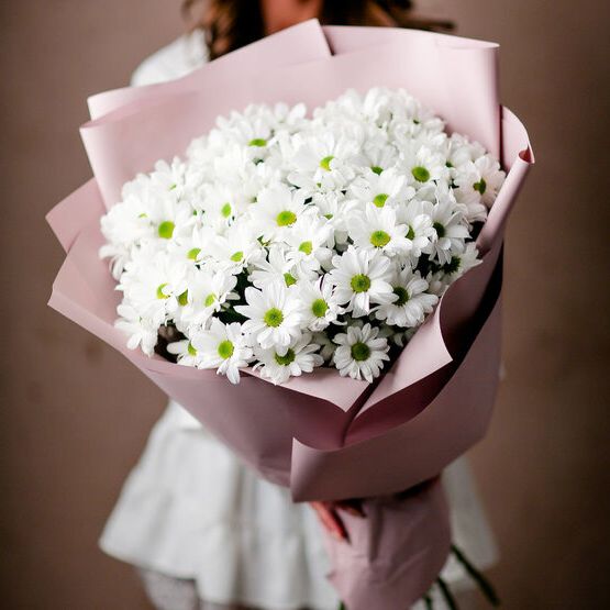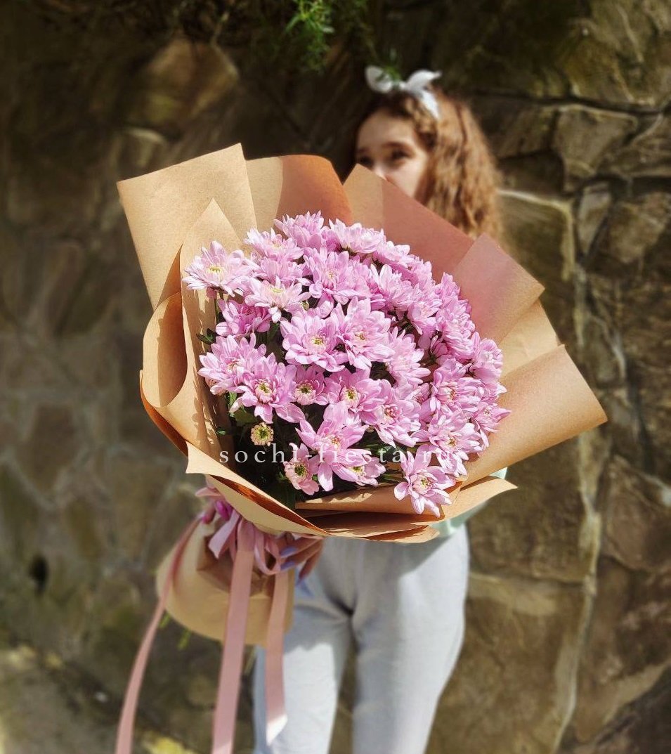 Пятнадцать веток кустовой хризантемы в натуральном крафте. Множество мелких соцветий формируют пышную шапку с естественной россыпью бутонов, подчёркнутую простотой оформления.