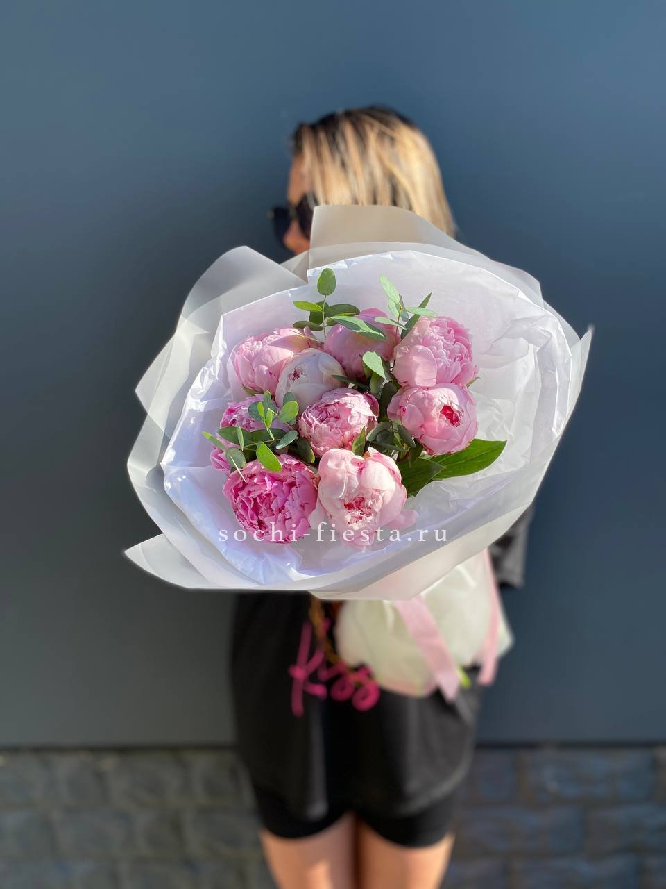 9 пионов, эвкалипт, лента, дизайнерская упаковка.