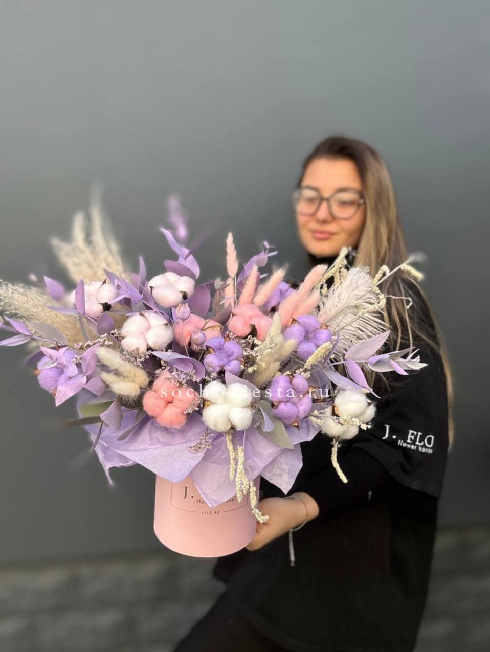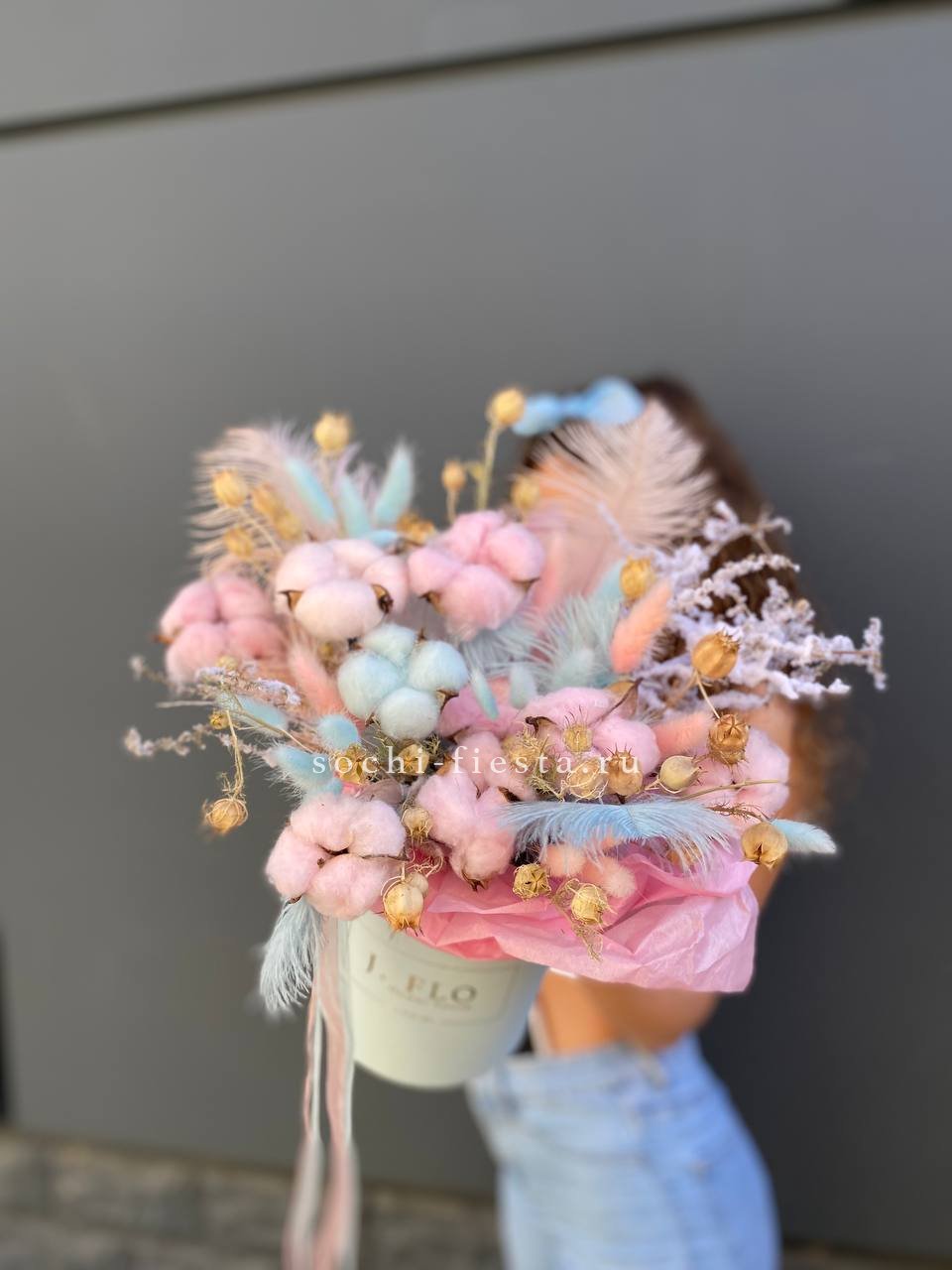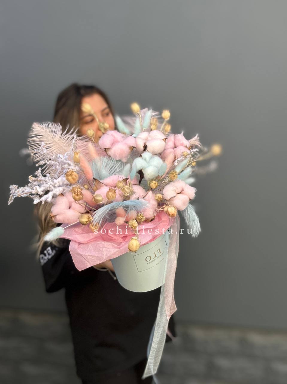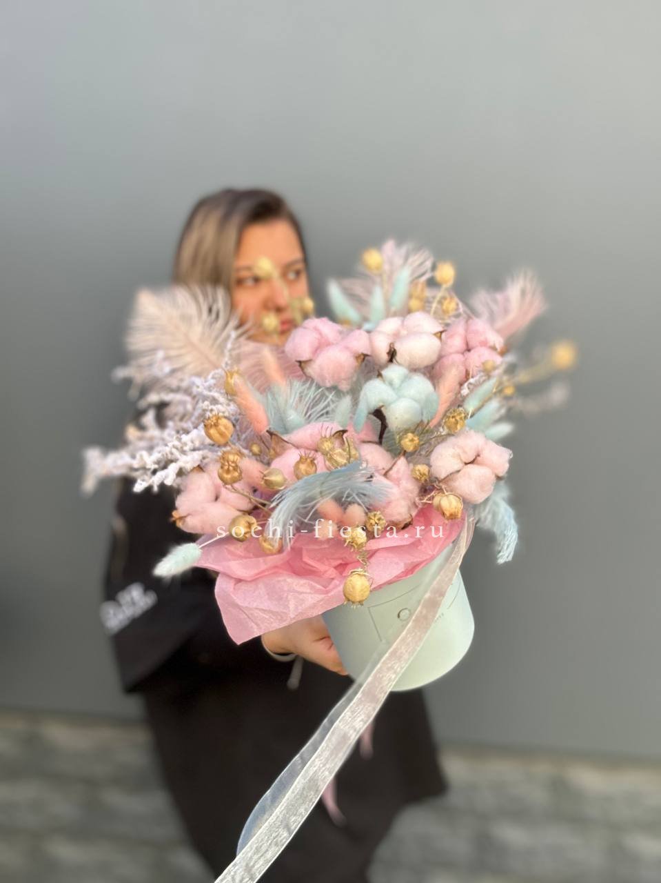 Бокс с природными текстурами: мягкость хлопка, воздушность лагуруса и графичность амаранта. Перья добавляют легкости. Композиция держит форму и не теряет выразительности со временем.
