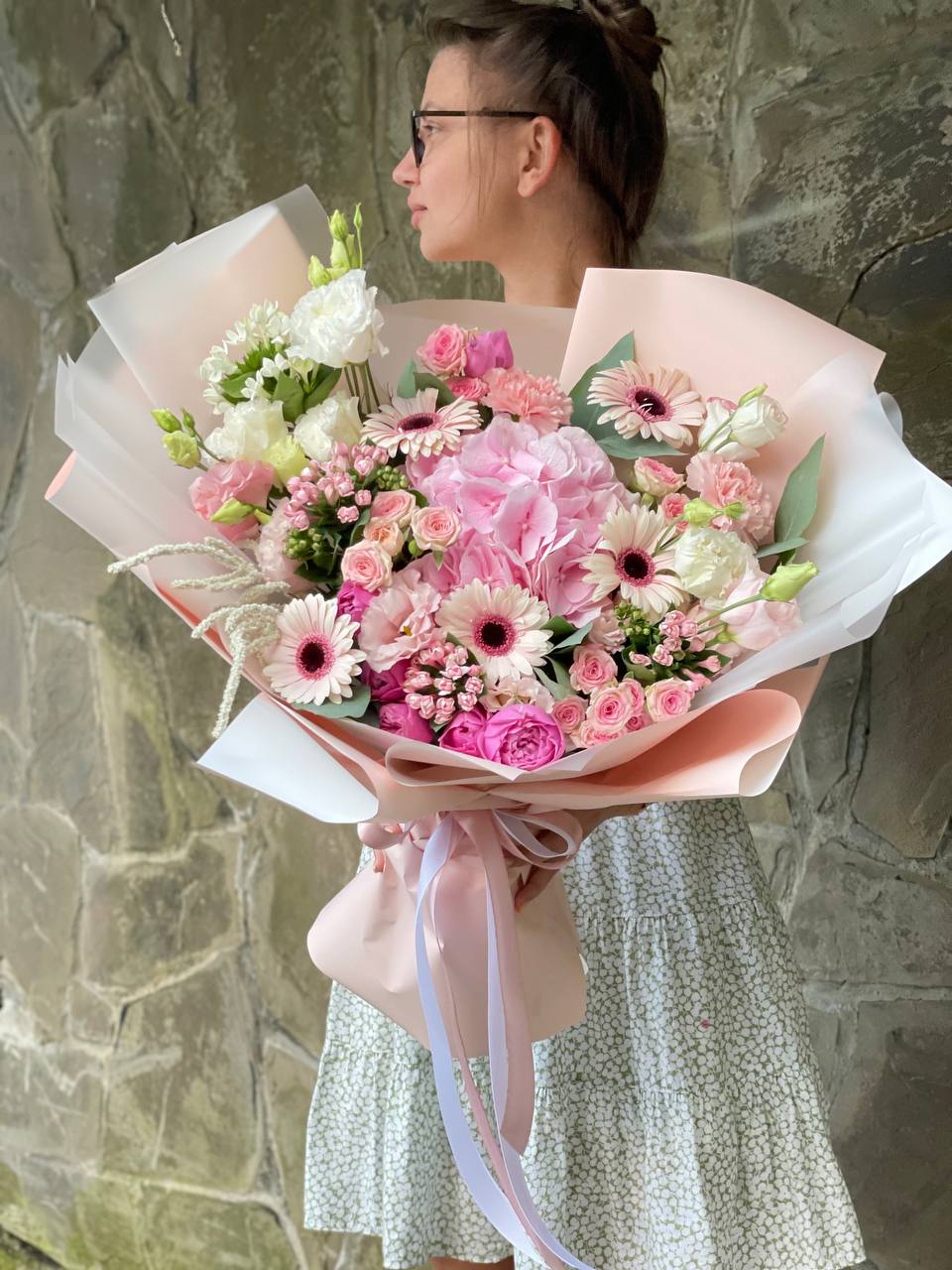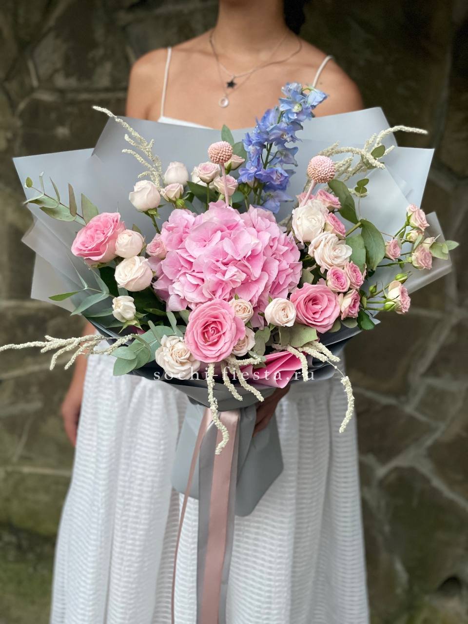 гортензии, роза одноголовая, роза кустовая, гербера, озотамнус, диантус, эвкалипт, декоративные перья, лента, дизайнерская упаковка.