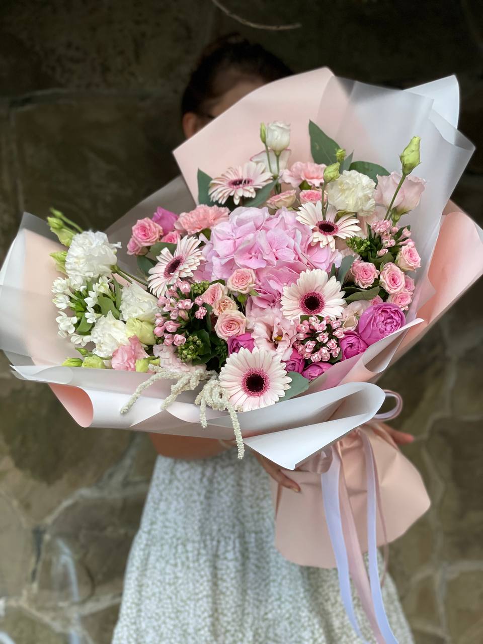 Пышные соцветия гортензий перекликаются с герберами и розами, создавая многослойную композицию с выразительной глубиной. Озотамнус и перья добавляют воздушности, а эвкалипт собирает все оттенки в единый ритм. Букет для тех, кто видит красоту в деталях.