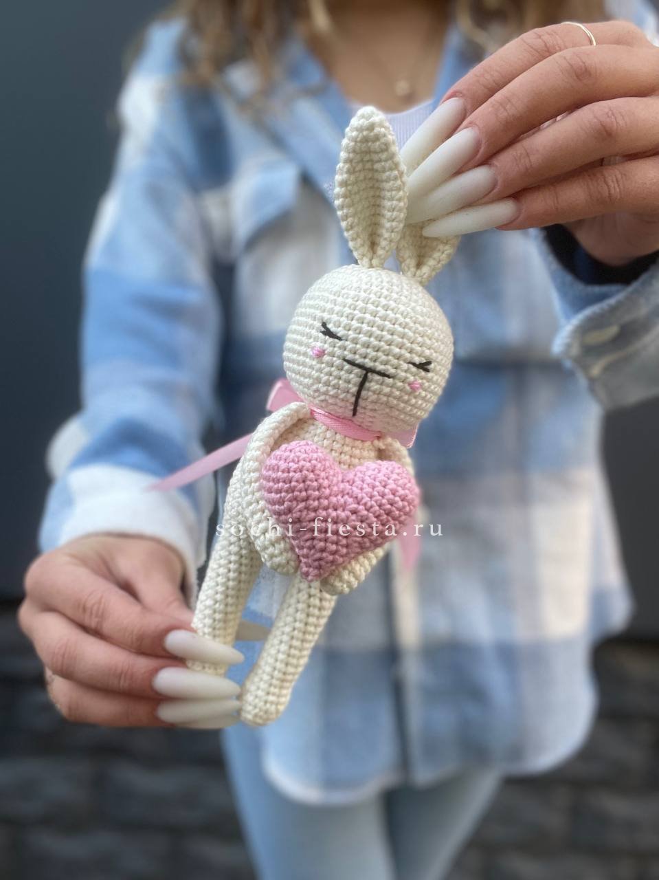Зайка держит красное сердце в лапках — готовый жест без лишних слов. Фактура плетения мягкая и объёмная. Трогательный акцент рядом с живыми цветами