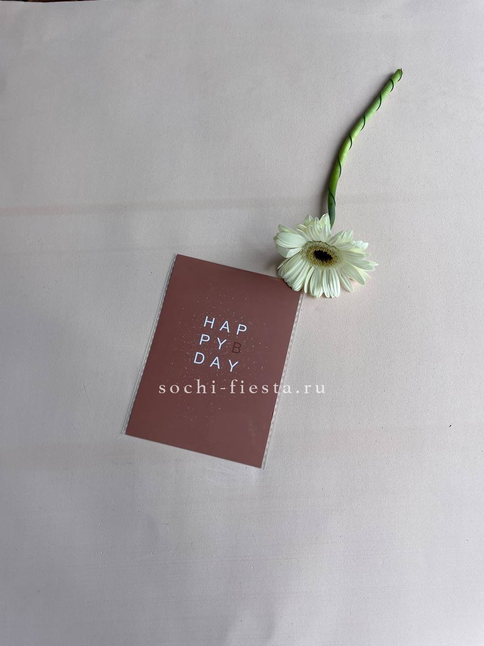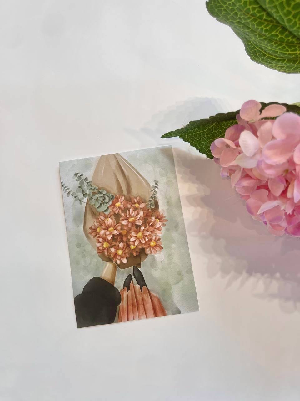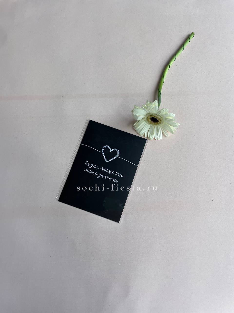 Лаконичная карточка с графичным слоганом добавляет букету характер. Минималистичный формат и чёткая типографика создают современный акцент.