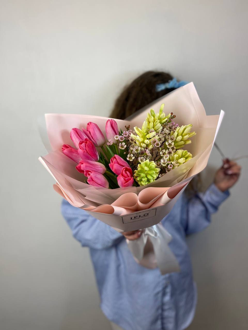 Весенний дуэт тюльпанов и гиацинтов собран в плотную композицию с воздушными веточками хамелациума. Бутоны раскрываются постепенно, наполняя пространство свежим ароматом и яркими красками. Букет сохраняет форму и радует несколько дней подряд.
