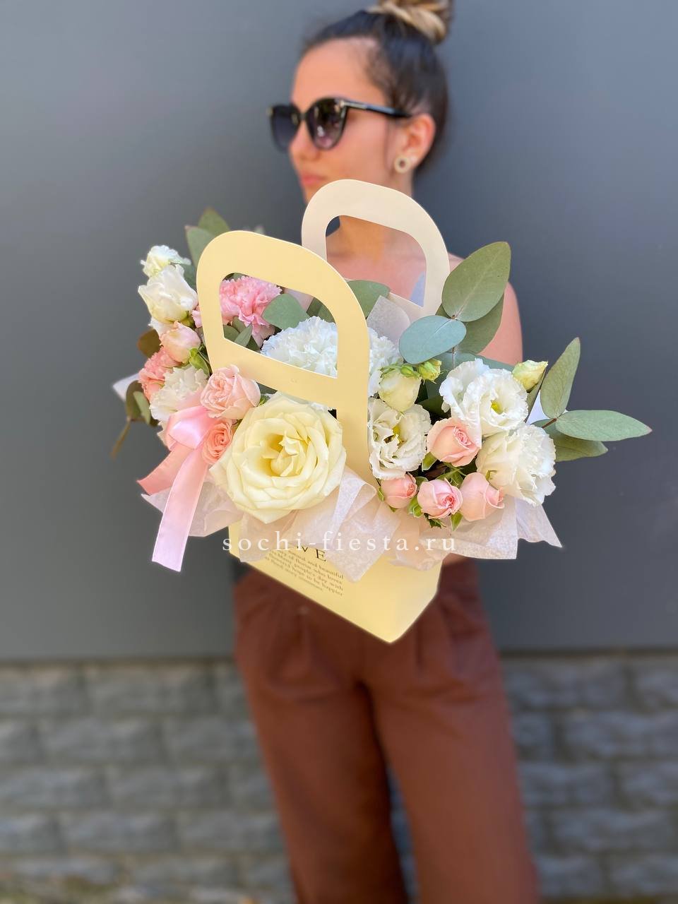 эустома, кустовые розы, белые розы, диантусы, лента, сумка-кашпо.
