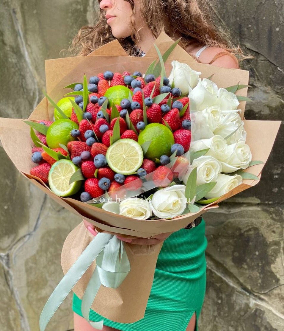 Сочная клубника соседствует с яркими дольками лайма, а розы добавляют композиции живой объём. Голубика завершает гамму насыщенными тёмными акцентами.