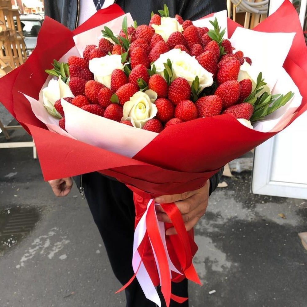 700-800г. ароматной клубники, белая роза - 9 шт., лента, дизайнерская бумага.