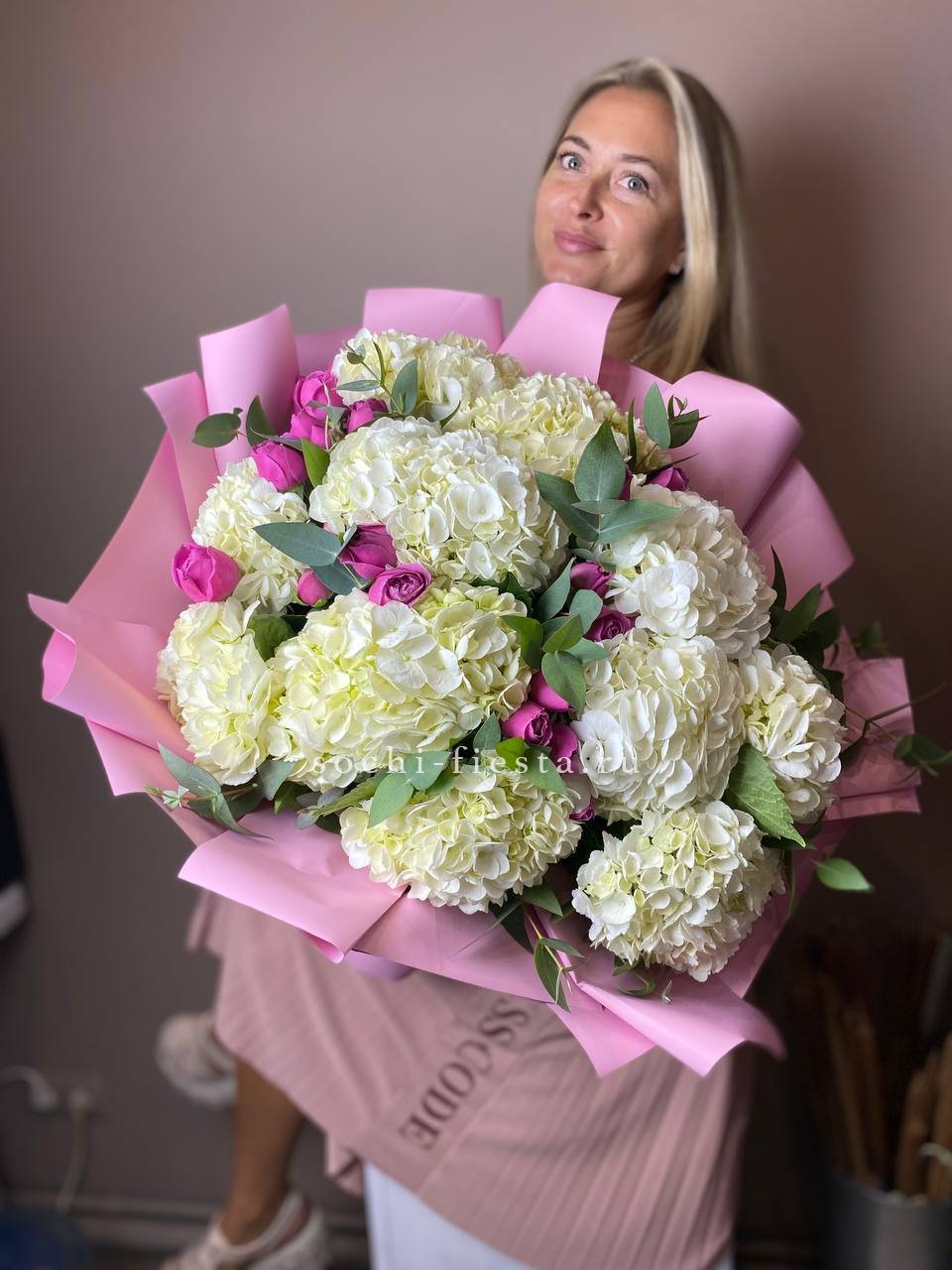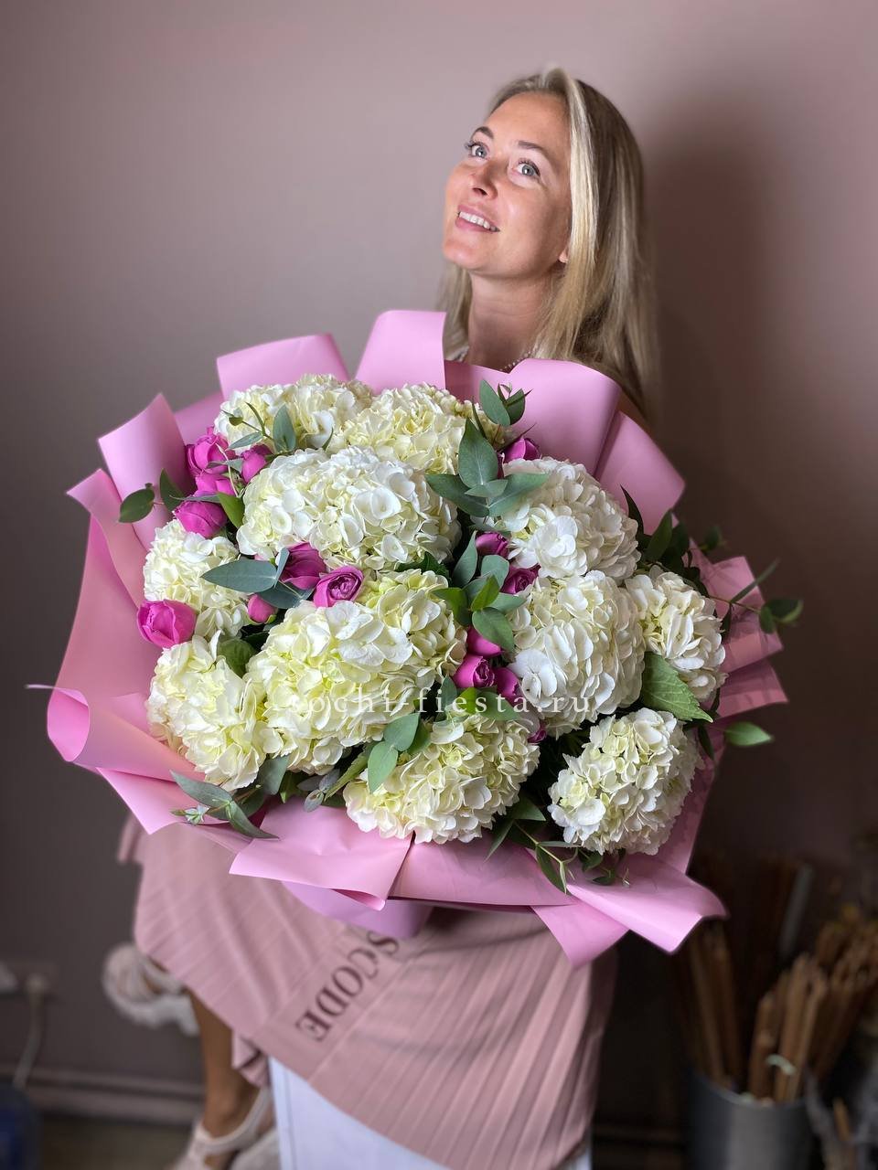 гортензия, диантус, розовые розы, маттиола, эустома, амарант, бусы (возможна замена), джутовое кашпо.