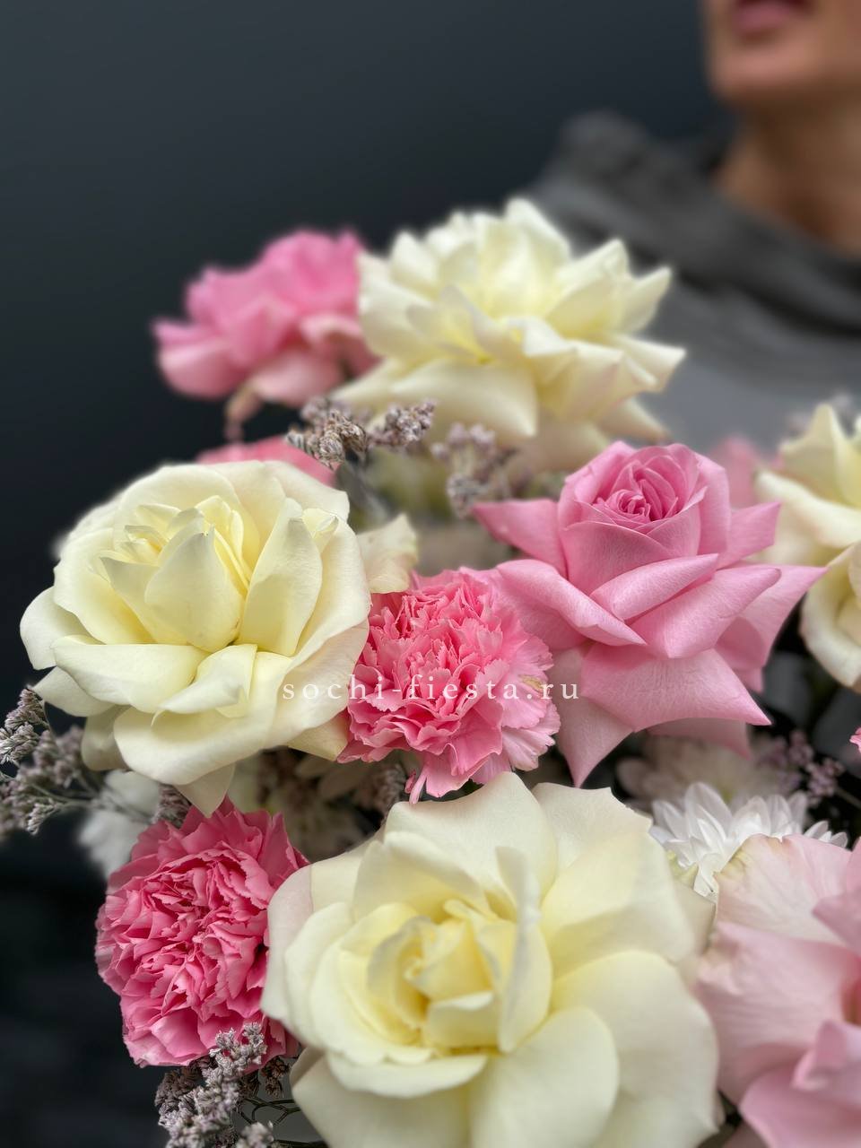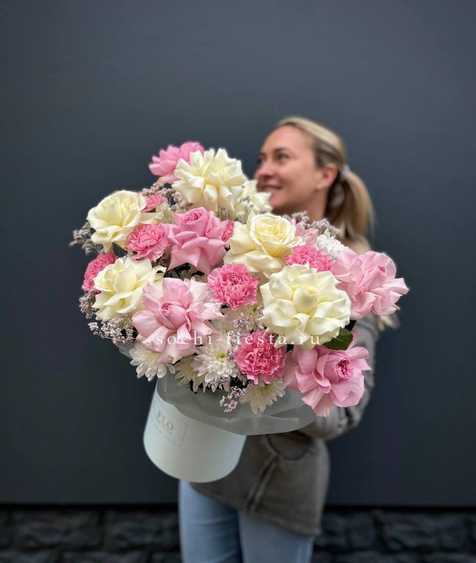 Для заказа товара "Коробка французских роз и диантусов "Бони"" с доставкой в Северодвинске нажмите в корзину
