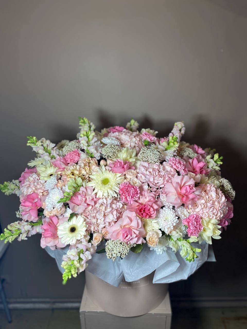 хризантемы, герберы, розы, антиринум, диантус, гортензия, бомбастик, озатамус в коробке или корзине на выбор.