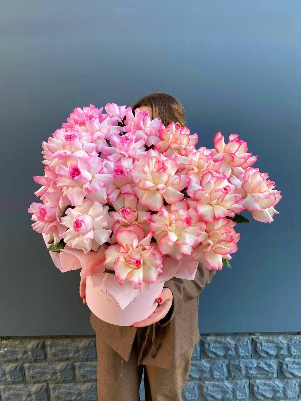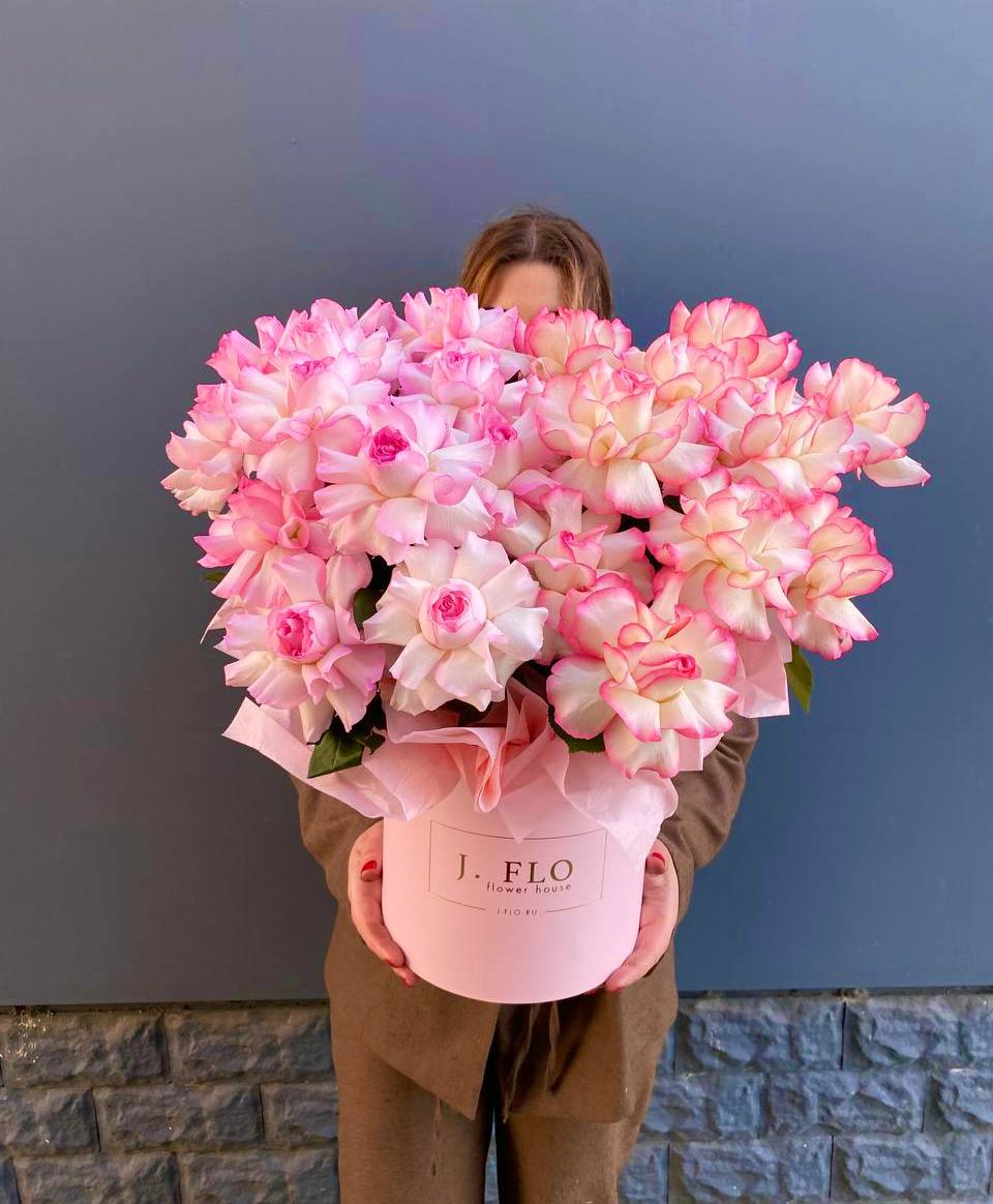 Двадцать пять вывернутых французских роз наполняют белый цилиндр графичной структурой. Бутоны раскрыты плотно, лепестки образуют многослойную текстуру с мягкими изгибами и глубиной.