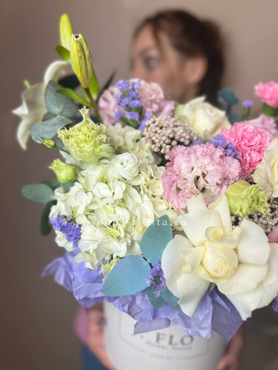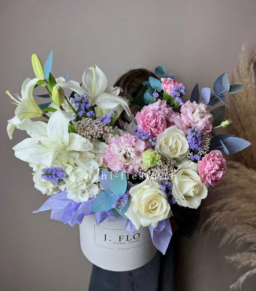 Белые розы и гортензия формируют объёмную основу, лилии вытягивают композицию вверх. Диантус и статица заполняют промежутки, создавая плотную текстуру в цилиндре.