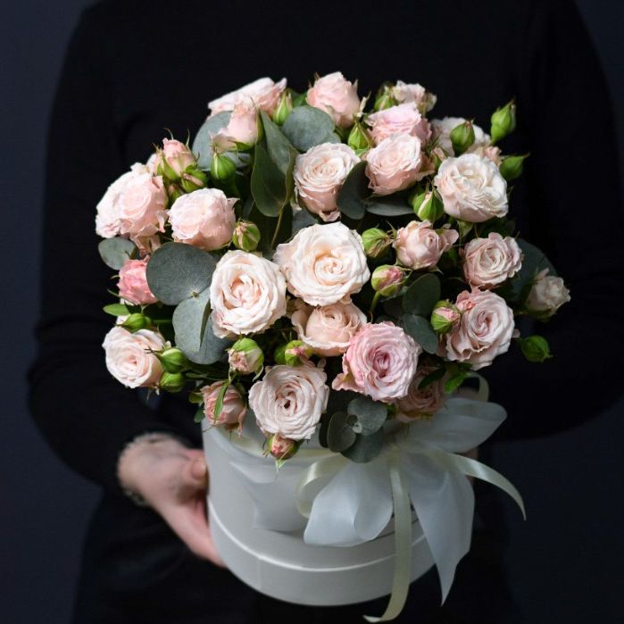 Композиция в коробке объединяет пышную гортензию, воздушную эустому и кустовые розы, Джумилию с яркими гербами и хлопком. Плотное заполнение создает округлую форму, где каждый цветок находит свое место без пустот.