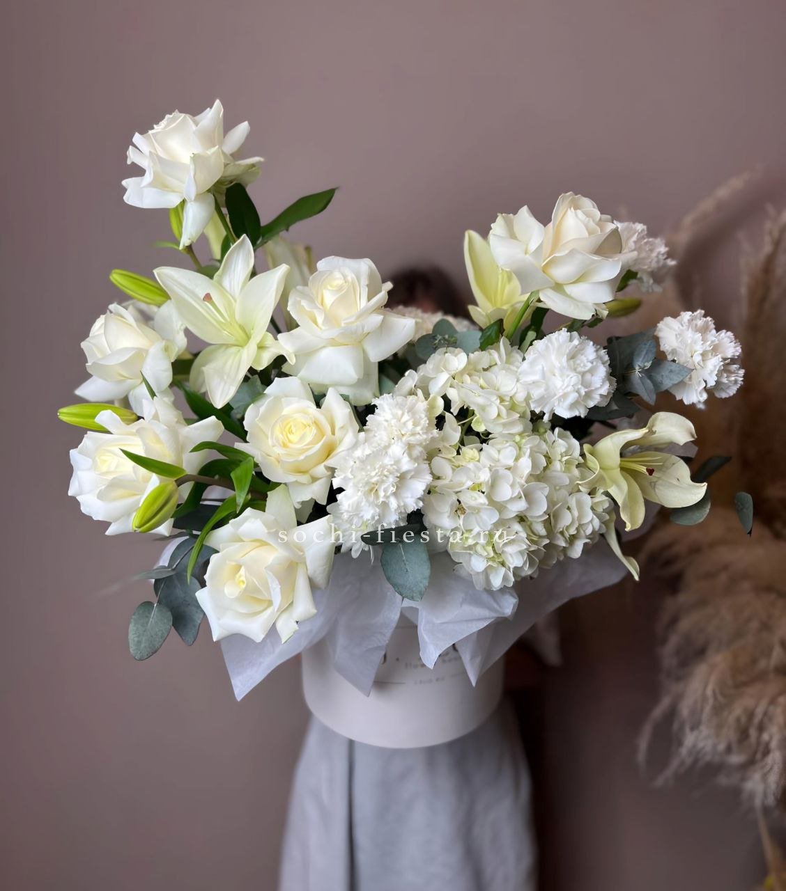 Белоснежная гамма раскрывается через лилии, розы и пышную гортензию с добавлением диантуса. Эвкалипт придает объём и глубину всей композиции в цилиндре.