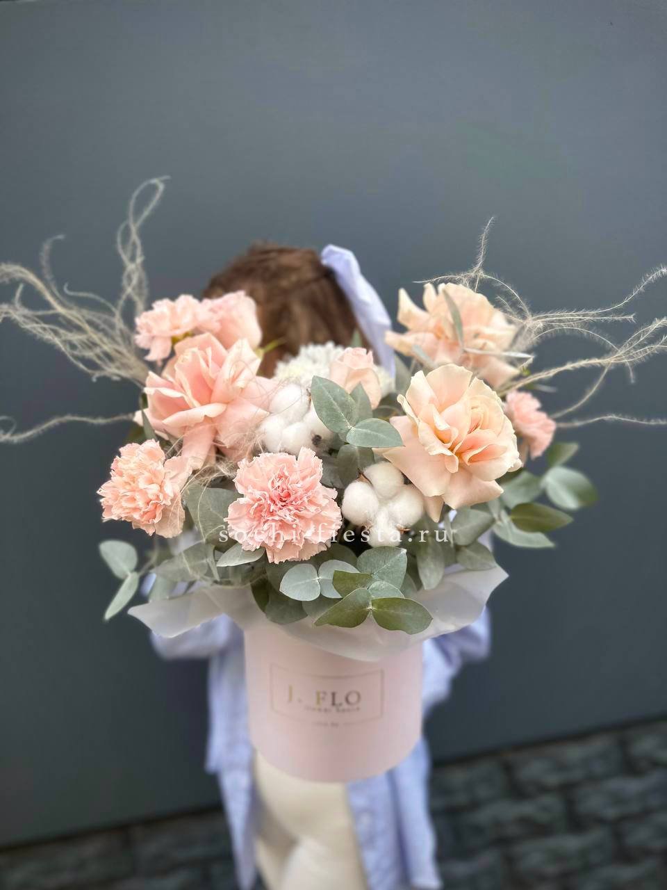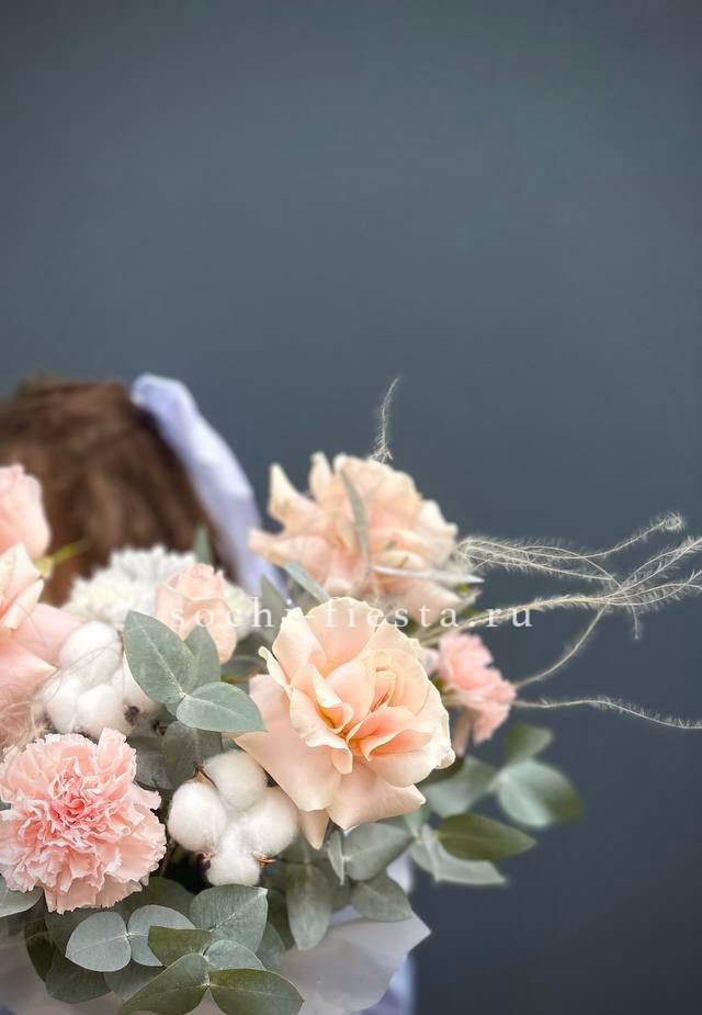 Пионы раскрываются пышными головками, окружённые воздушной статицей и многослойной эустомой. Маттиола вносит лёгкую небрежность, а диантусы расставляют яркие точки в общей картине.