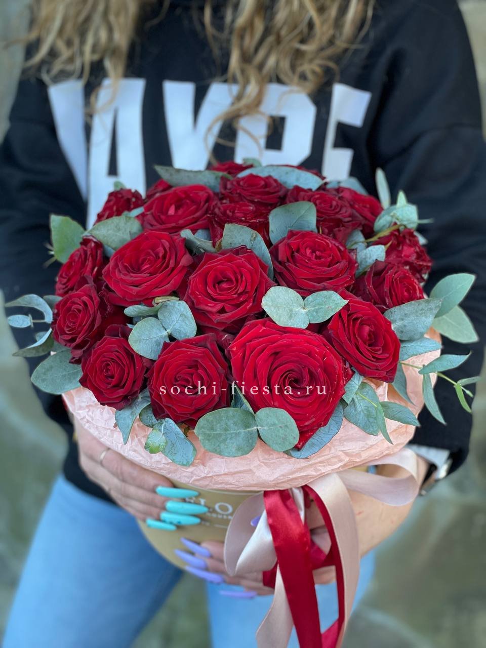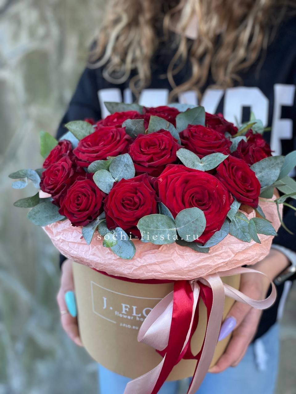 кустовые пионовидные розы сорта Джульетта, цилиндр D20, эвкалипт, лента, тишью.