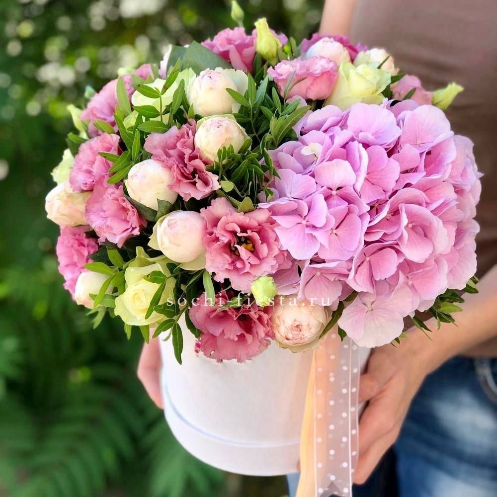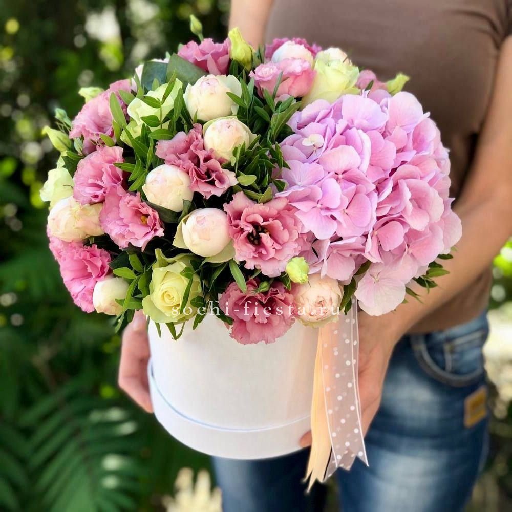 гортензия, пионовидные розы, эустома, эвкалипт, бокс 16.