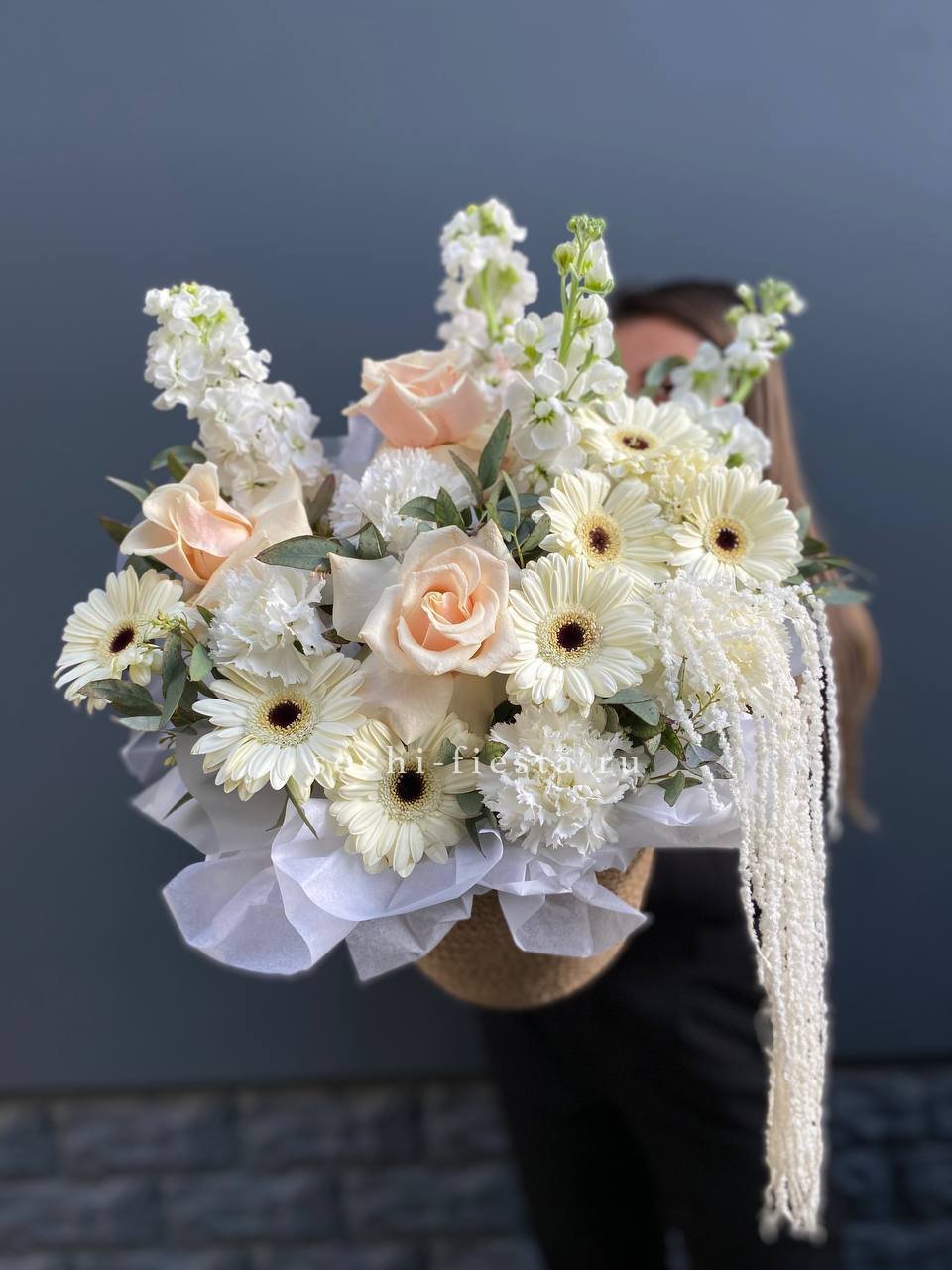 герберы, французские розы, маттиола (аналог), диантусы, амарант и эвкалипт. Цвет роз и диантусов могут отличаться, в тон композиции.