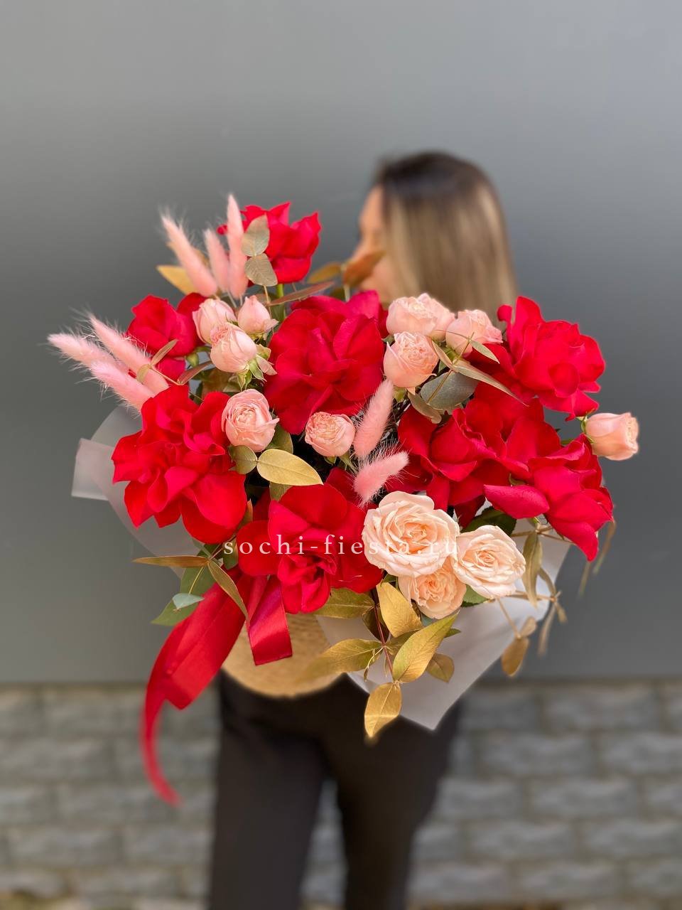 маттиола, французские розы, кустовые пионовидные розы, дианутсы, амарантус.