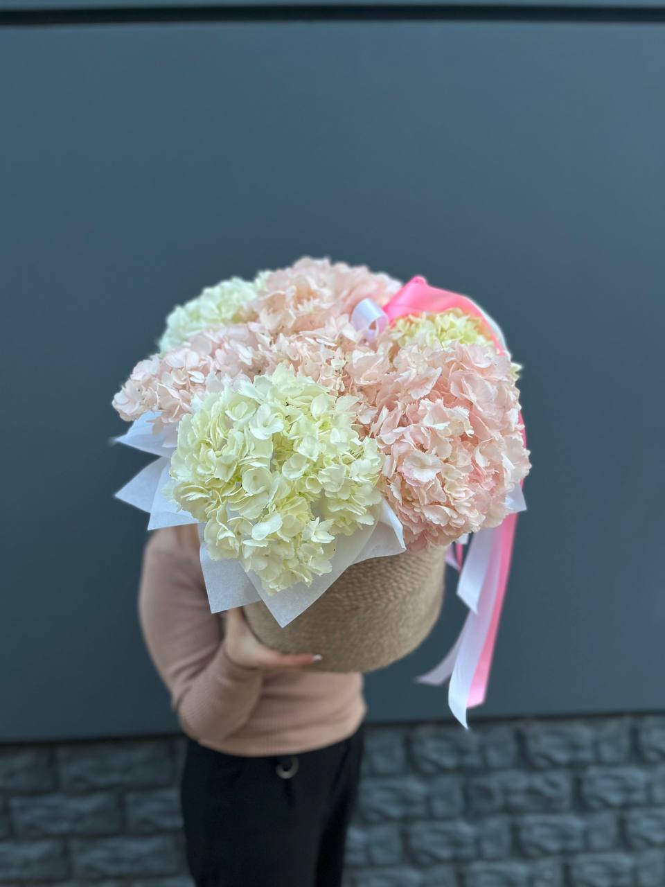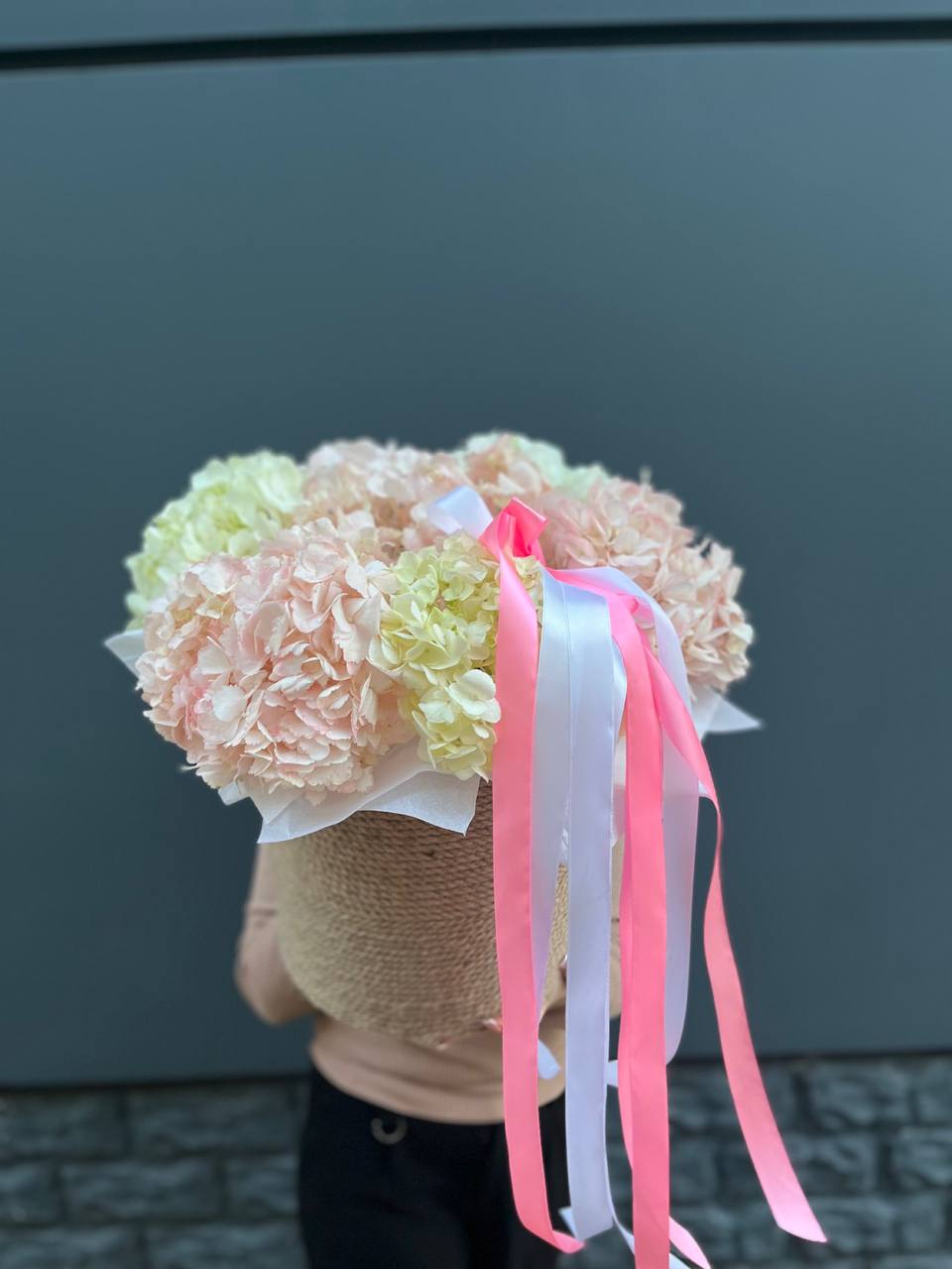 Воздушная гортензия окружает розы пудровых и снежных оттенков, а эвкалипт добавляет глубину и свежесть. Композиция собрана в натуральное джутовое кашпо, которое удобно разместить на столе или подоконнике.