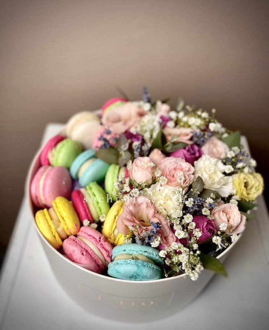 розы, пионовидные розы Мисти Баблс и бомбастик, розовая круглая коробка D20, 6 макаронс.