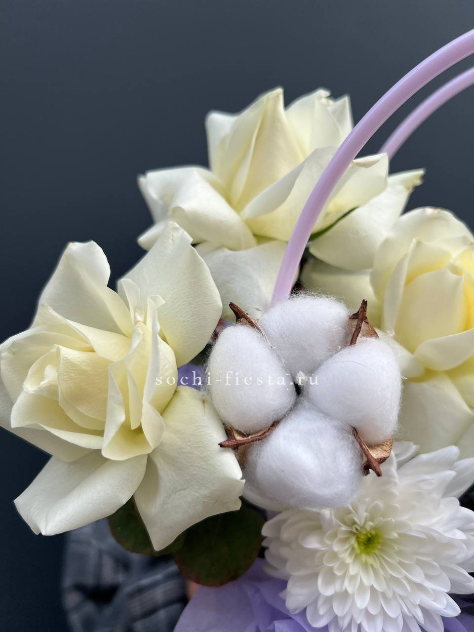 пионовидные кустовые розы, альстромерии, сумочка, лента.