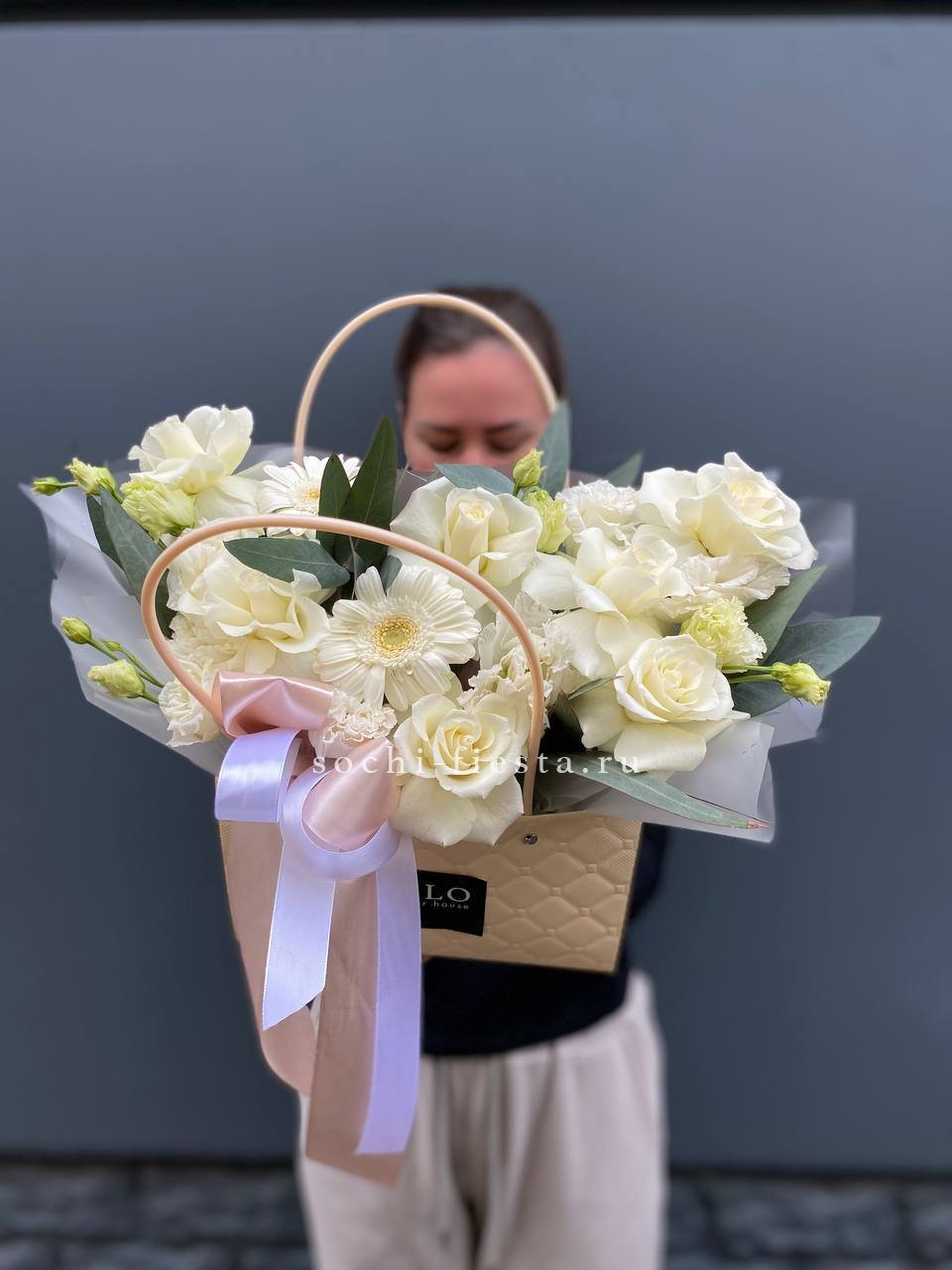 эустома, французские розы, эвкалипт, лилия, сумочка, оазис.