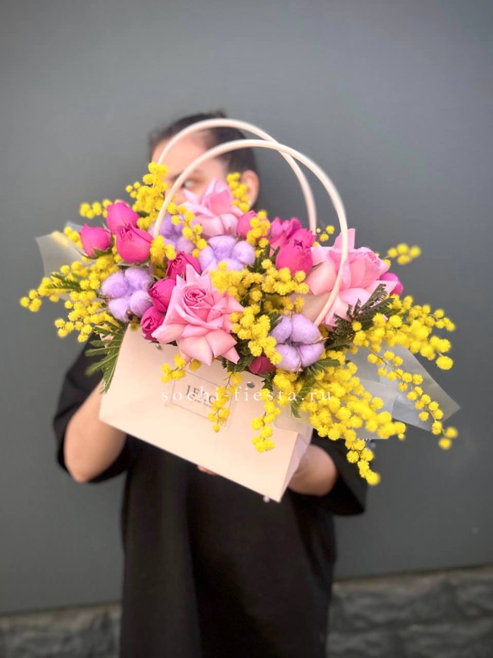 Розовые оттенки переплетаются с солнечными пушистыми шариками мимозы и белоснежным хлопком. Весенняя композиция в удобной сумочке дарит ощущение первых теплых дней и пробуждения природы.