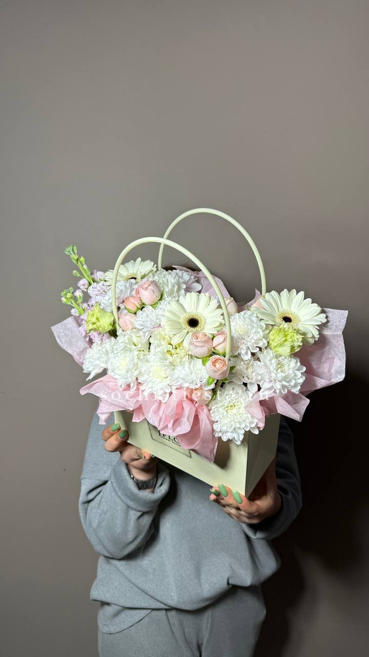 Белые розы и хризантемы сочетаются с воздушной эустомой и хлопком в сумочке. Светлая гамма с прохладным оттенком напоминает морскую свежесть и создает спокойное настроение.