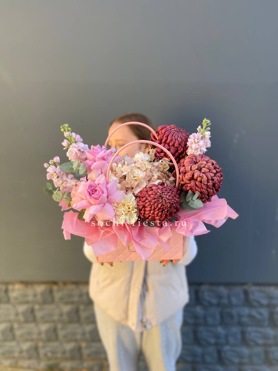 Композиция в сумочке собрана из розовых роз, гортензии и маттиолы с добавлением декоративных бигуди. Мягкая палитра и необычные детали создают легкое романтичное впечатление.