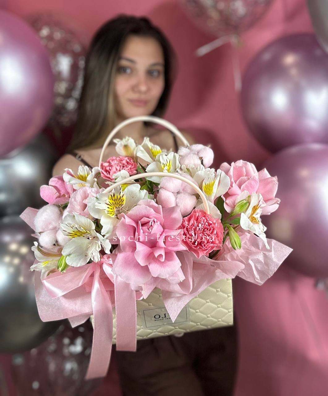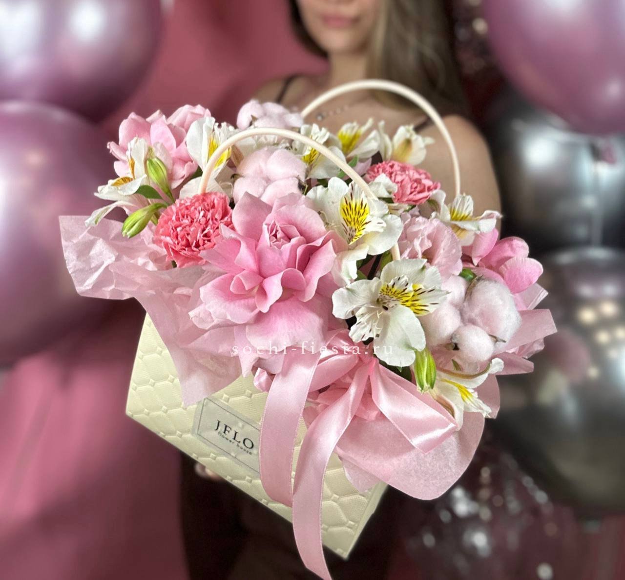 мисти баблс, диантус, эустома, сумочка.