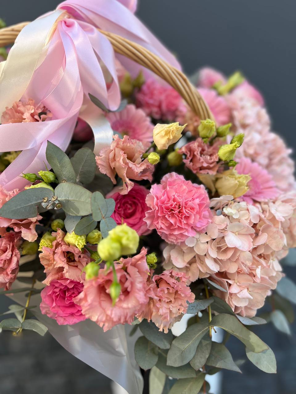гортензия, диантус, розовая роза, эустома, гербера, корзина средняя, наполнение.