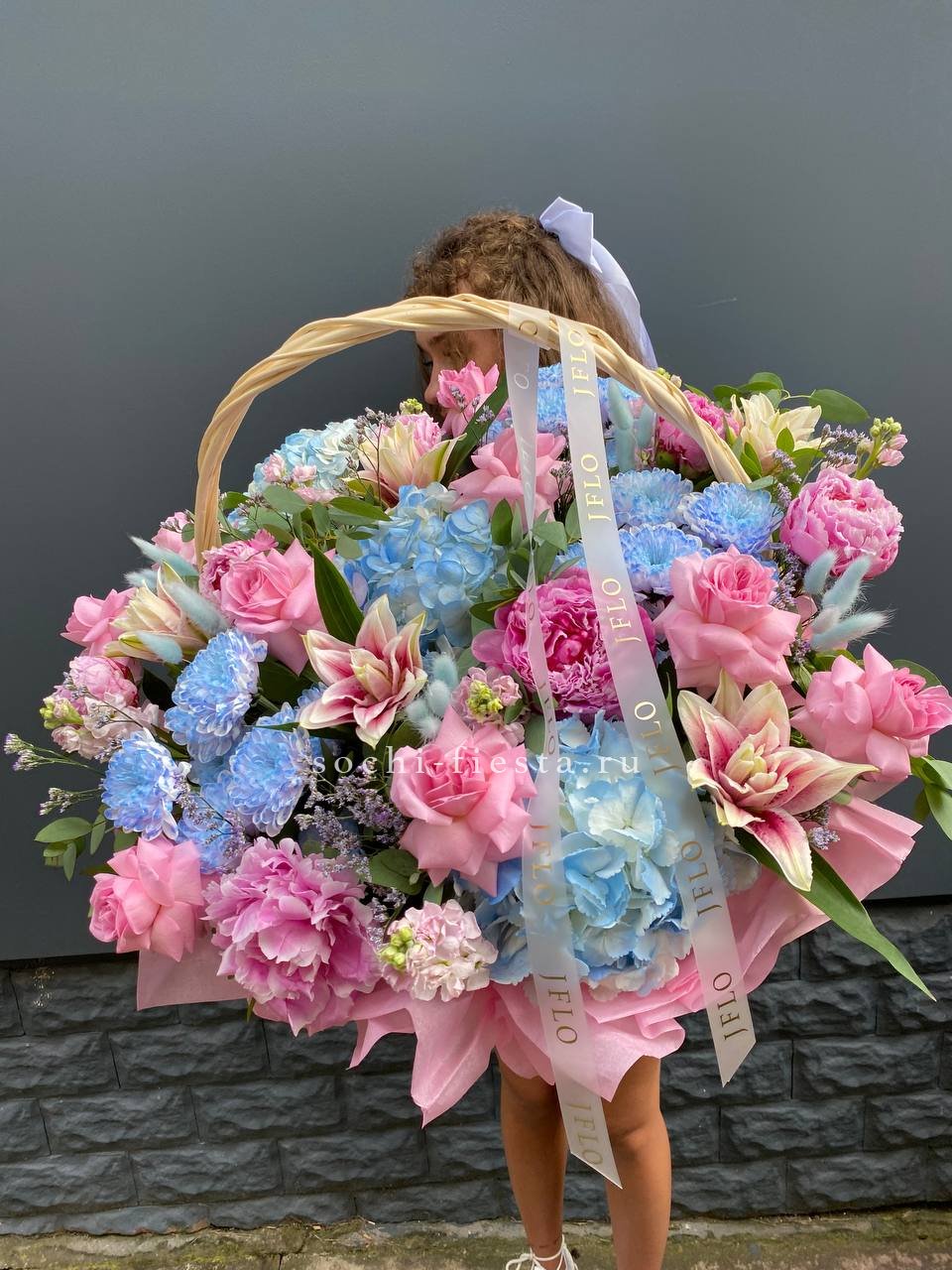 гортензии, лилии, хризантемы, пионы, лимониум, маттиола, корзина.