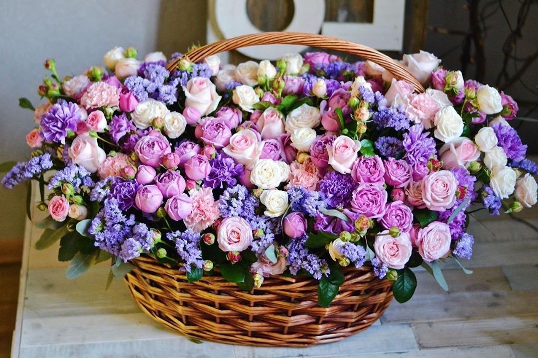 Плотная россыпь бутонов в плетеной корзине создает живописную композицию с переходами от сиреневых до пудровых оттенков. Гортензия и маттиола задают воздушный объем, а розы разной раскрытости добавляют глубину и многослойность всей картине.