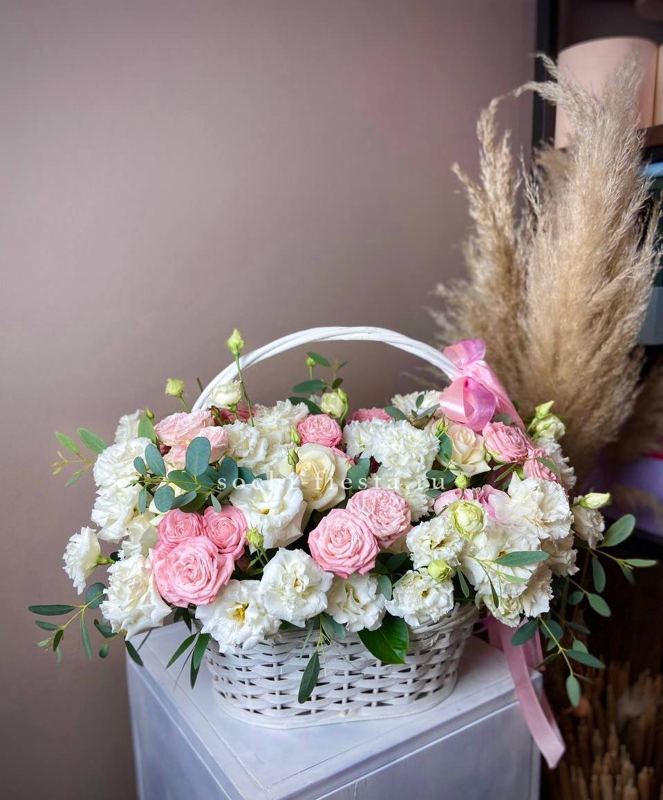 Плотная сферическая форма из пышных бутонов создаёт объёмную композицию в плетёной корзине. Ветки эвкалипта добавляют воздушности между головками цветов. Классическое решение для яркого события или знакового дня в жизни близкого человека.